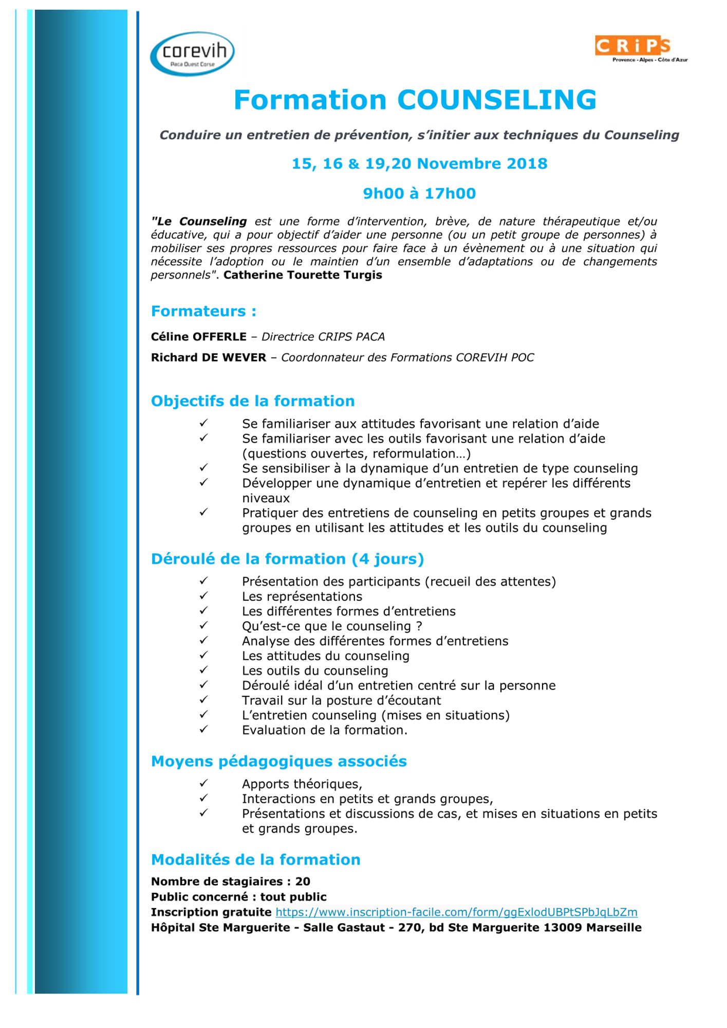 "Le Counseling est une forme d’intervention, brève, de nature thérapeutique et/ou éducative, qui a pour objectif d’aider une personne (ou un petit groupe de personnes) à mobiliser ses propres ressources pour faire face à un évènement ou à une situation qui nécessite l’adoption ou le maintien d’un ensemble d’adaptations ou de changements personnels". Catherine Tourette Turgis