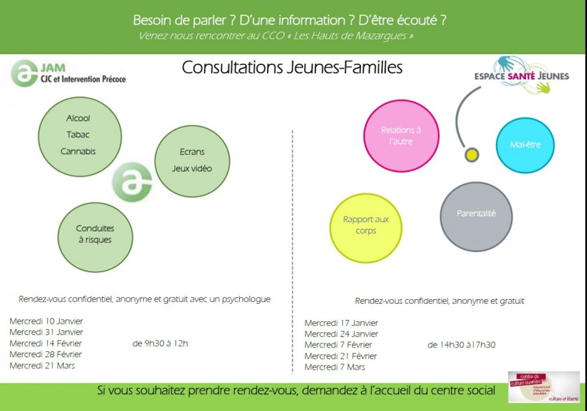 Des consultations Jeunes-familles sont proposées par l'Espace santé jeunes, Addictions Méditerranée CJC et Intervention précoce au Centre social les Hauts de Mazargues.