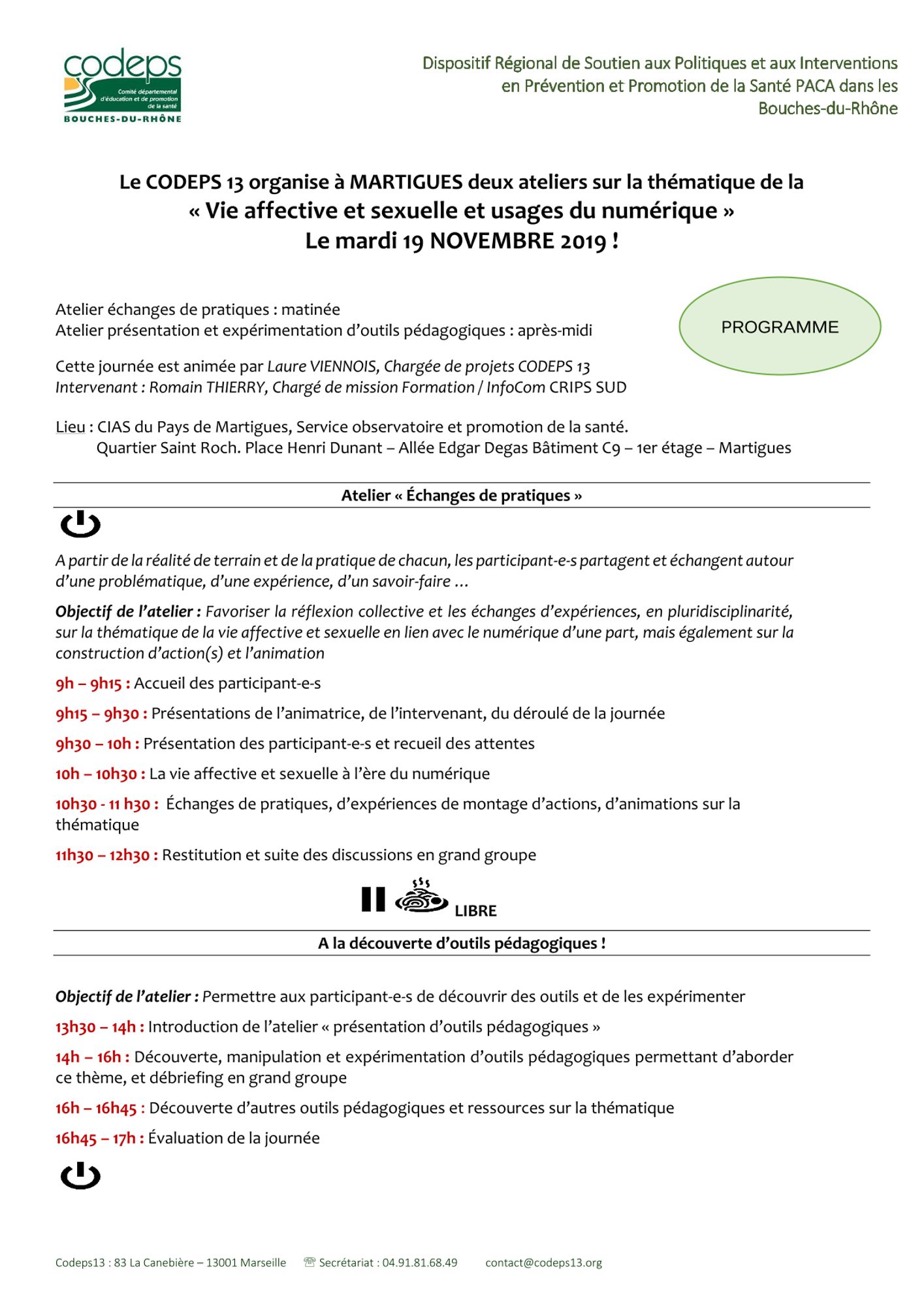Cette journée est animée par Laure VIENNOIS, chargée de projets au CoDEPS13 et Romain THIERRY, chargé de mission formation/InfoCom au CRIPS SUD