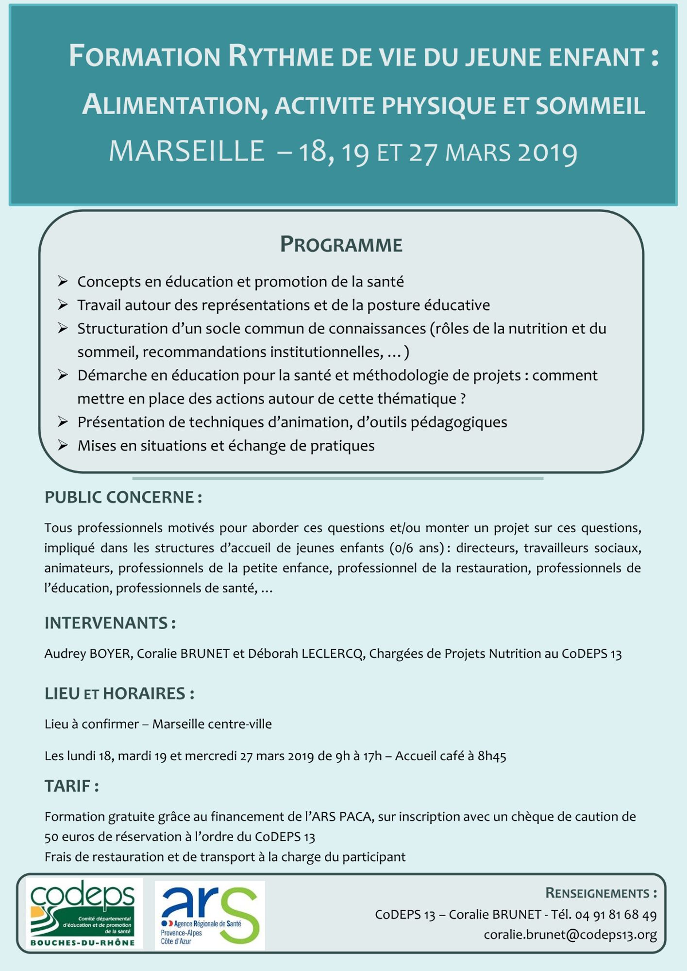 Formation gratuite grâce au financement de l’ARS PACA (demande d'un chèque de réservation de 50€ à l'ordre du CoDEPS 13 qui sera rendu à l'issue de la formation).