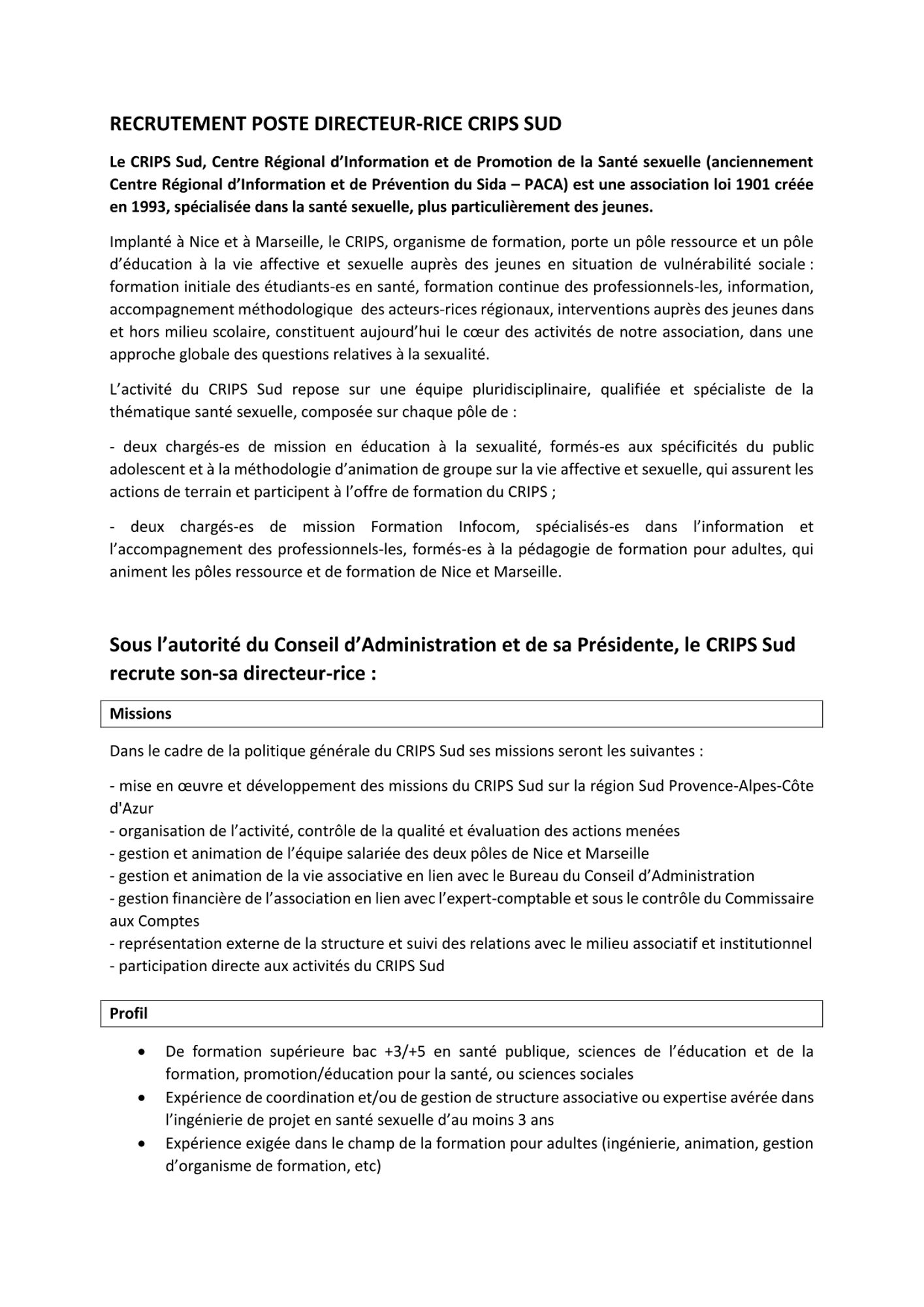 Le CRIPS Sud, Centre Régional d’Information et de Promotion de la Santé sexuelle (anciennement Centre Régional d’Information et de Prévention du Sida – PACA) est une association loi 1901 créée en 1993, spécialisée dans la santé sexuelle, plus particulièrement des jeunes.