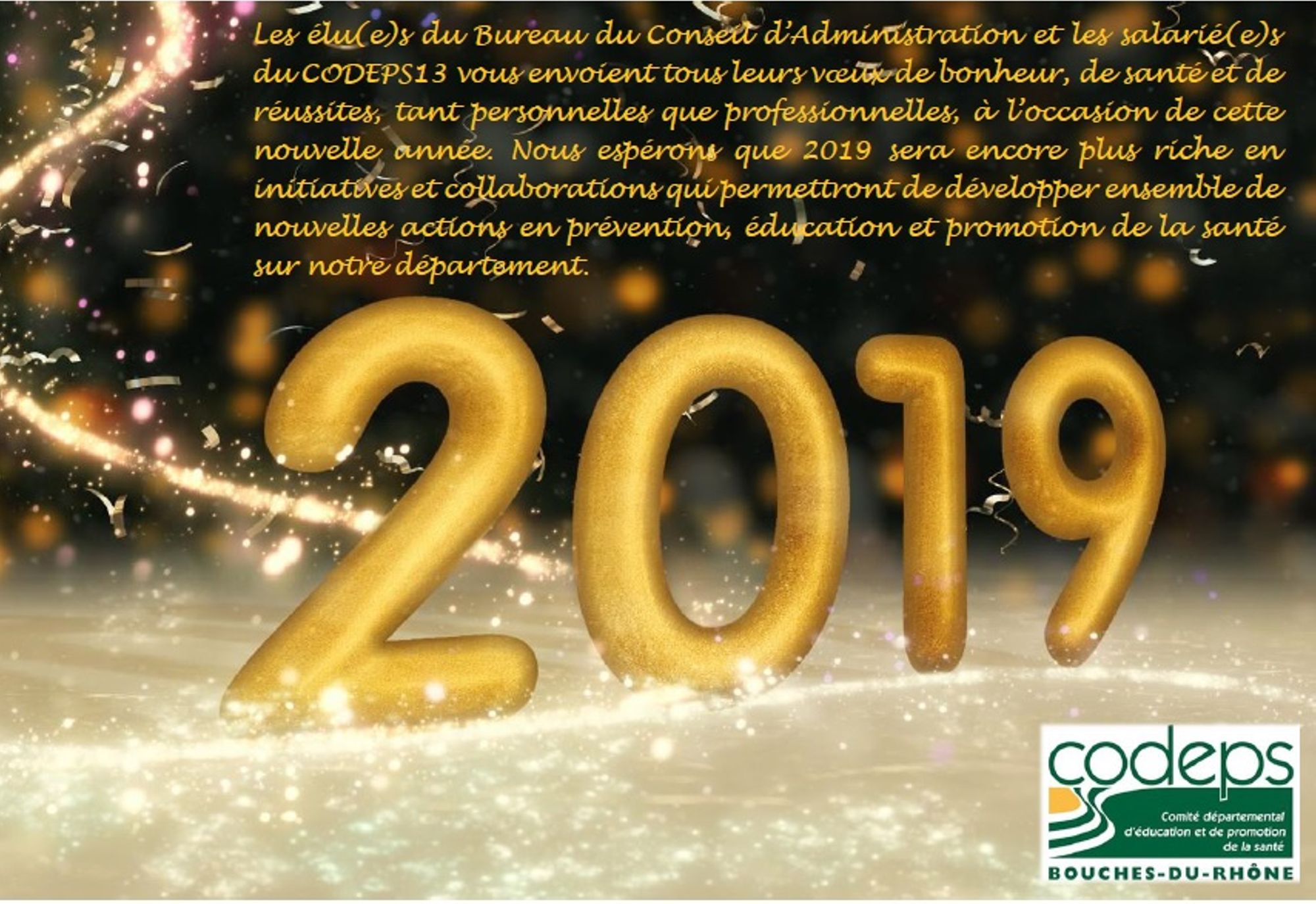 Les élu(e)s du Bureau du Conseil d’Administration et les salarié(e)s du CODEPS13 vous envoient tous leurs vœux de bonheur, de santé et de réussites, tant personnelles que professionnelles, à l’occasion de cette nouvelle année. Nous espérons que 2019 sera encore plus riche en initiatives et collaborations qui permettront de développer ensemble de nouvelles actions en prévention, éducation et promotion de la santé sur notre département.
