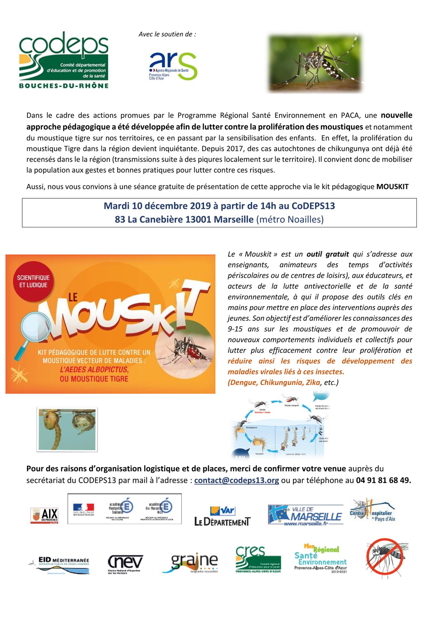 Dans le cadre des actions promues par le Programme Régional Santé Environnement en PACA, une nouvelle approche pédagogique a été développée afin de lutter contre la prolifération des moustiques et notamment du moustique tigre sur nos territoires, ce en passant par la sensibilisation des enfants. En effet, la prolifération du moustique Tigre dans la région devient inquiétante. Depuis 2017, des cas autochtones de chikungunya ont déjà été recensés dans le la région (transmissions suite à des piqûres localement sur le territoire).