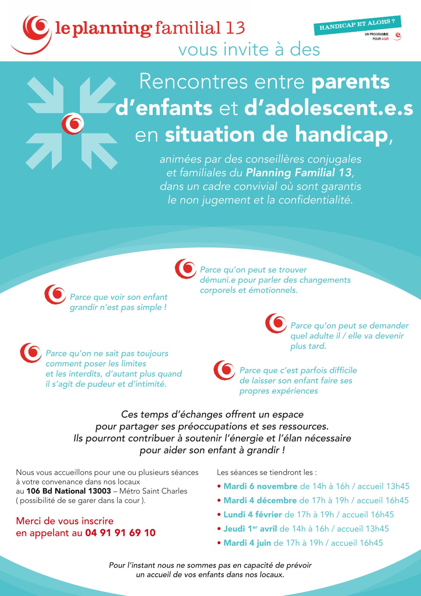 Dans le cadre du projet "Handicap, et alors ?", les conseillères conjugales et familiales du Planning familial 13 vous invitent à des