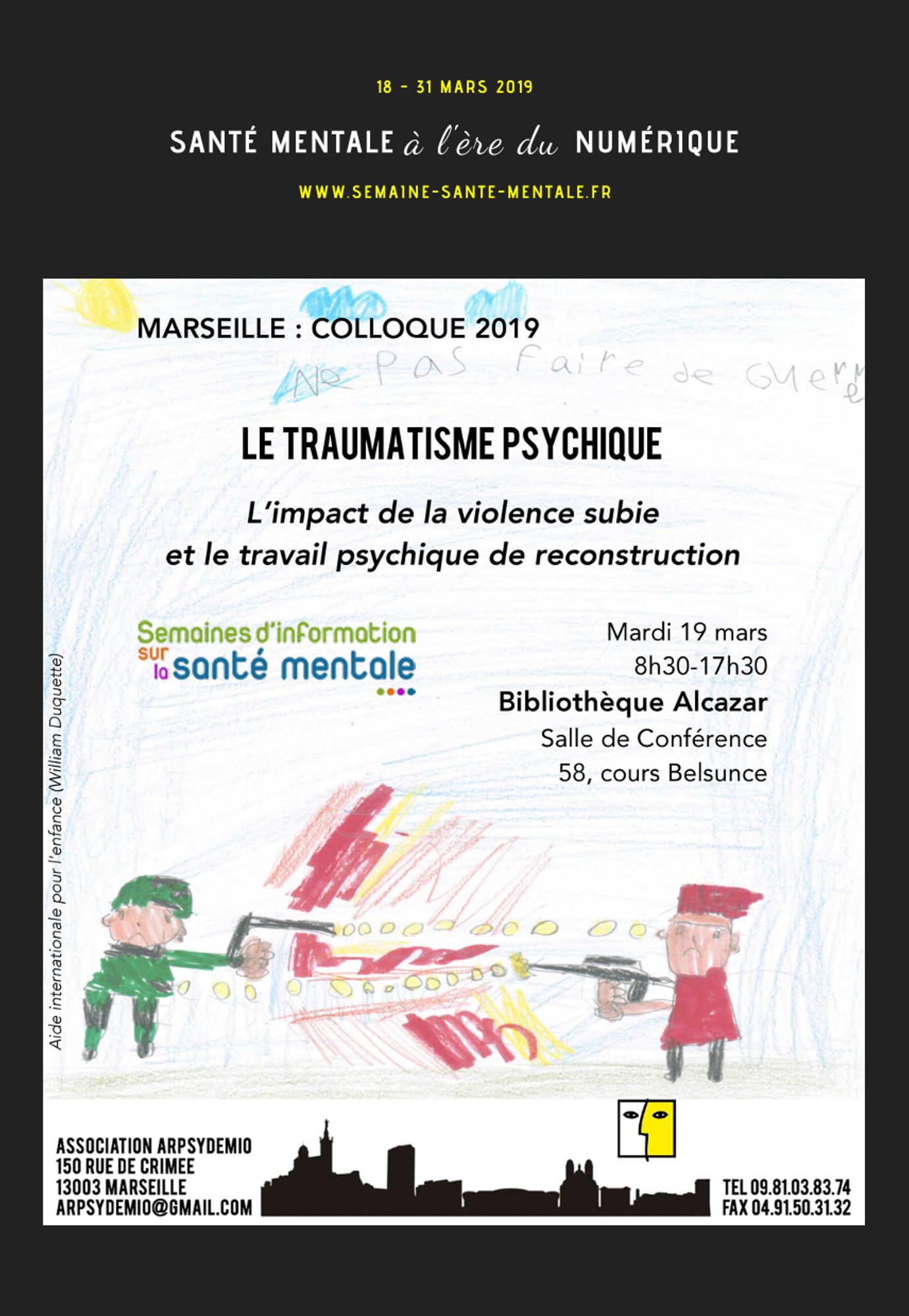 - Marseille - Mardi 19 mars 8h30-17h : colloque Arpsydemio : "Le traumatisme psychique. L'impact de la violence subie et le travail psychique de reconstruction"