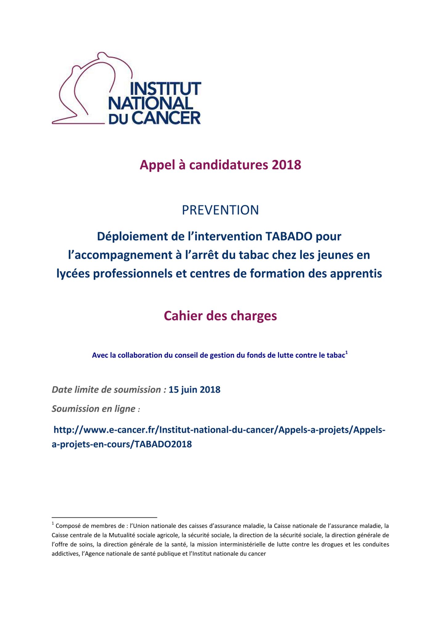 Dans le cadre du fonds de lutte contre le tabac, l’Institut national du cancer souhaite promouvoir l’accompagnement à l’arrêt du tabac chez les jeunes en situation vulnérable, en soutenant le déploiement de l’intervention « Tabado » dans l’ensemble des régions au sein des centres de formation des apprentis (CFA) et des lycées professionnels.