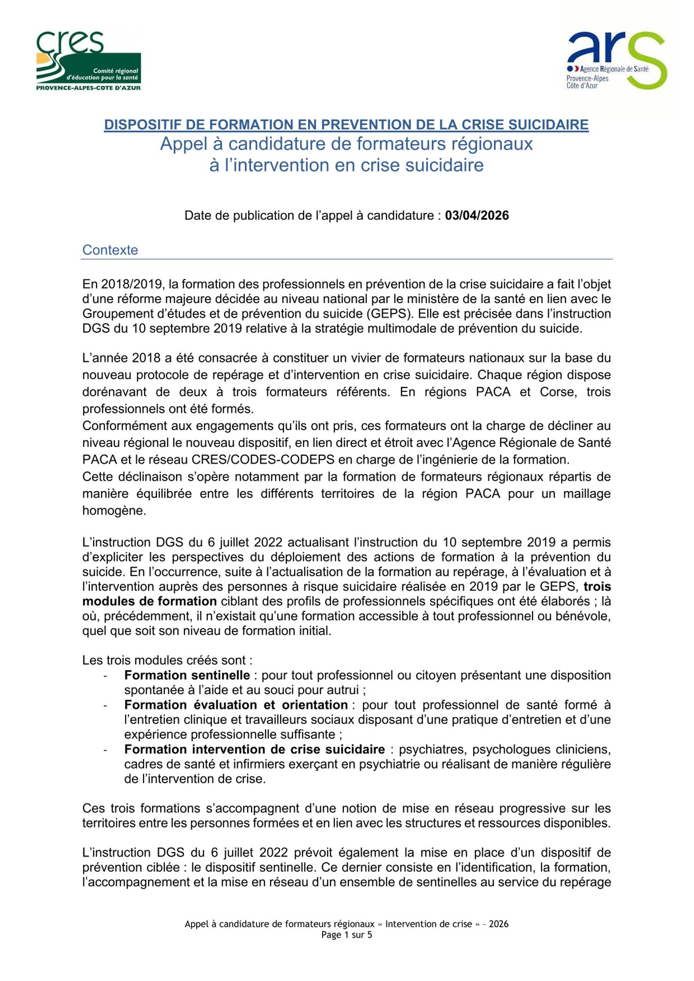 Dans le cadre du Dispositif de formation à la prévention de la crise suicidaire, le CRES organise une formation de formateurs régionaux à l'intervention de crise. Cette formation permettra ensuite aux participant.e.s de former en interne, dans leur structures, afin de diffuser plus largement la connaissance sur la crise suicidaire.