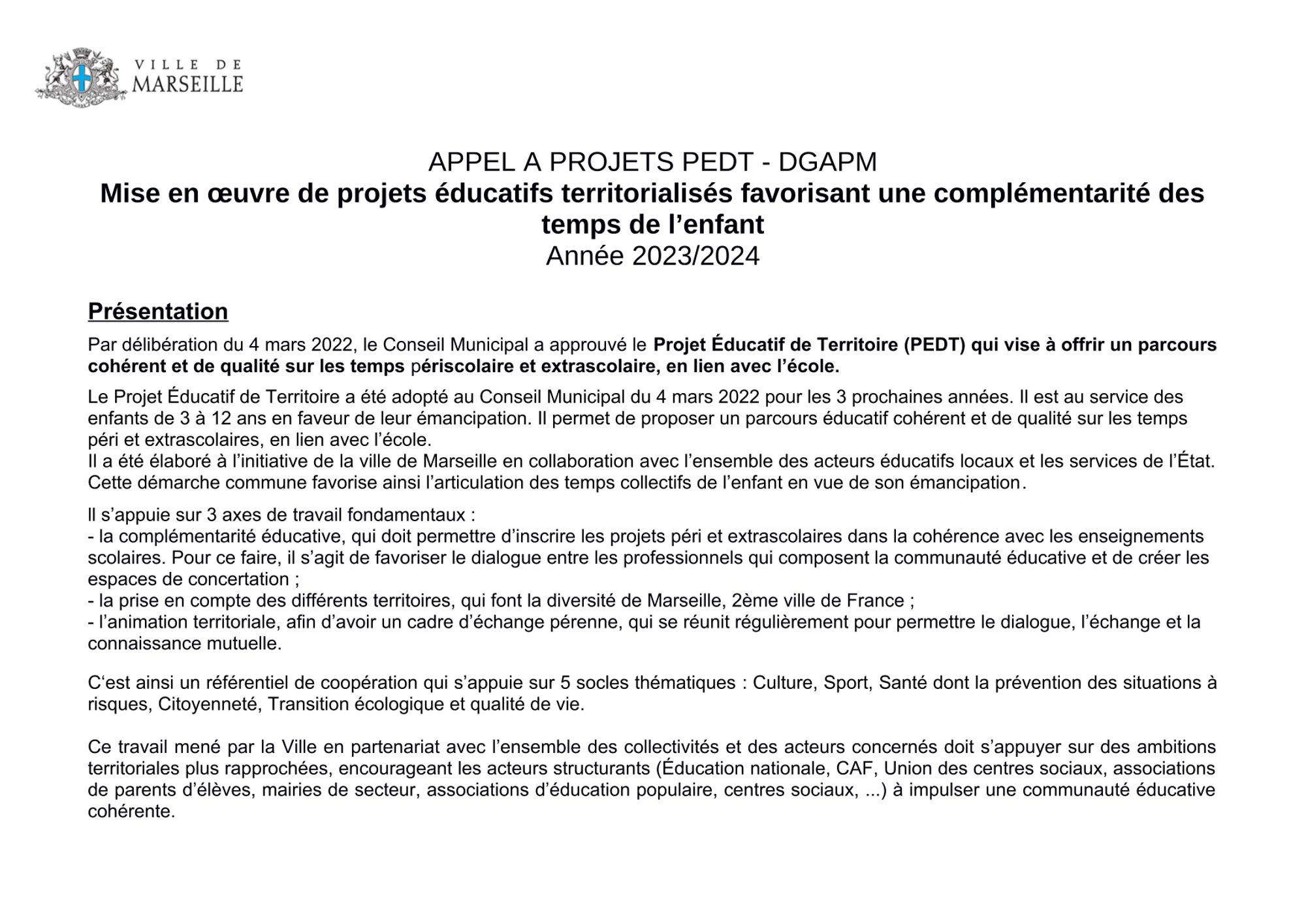 Le Projet Éducatif de Territoire (PEDT) est au service des enfants de 3 à 12 ans en faveur de leur émancipation. Il a été élaboré à l’initiative de la ville de Marseille en collaboration avec l’ensemble des acteurs éducatifs locaux et les services de l’État. Il vise à offrir un parcours cohérent et de qualité sur les temps périscolaire et extrascolaire, en lien avec l’école.
