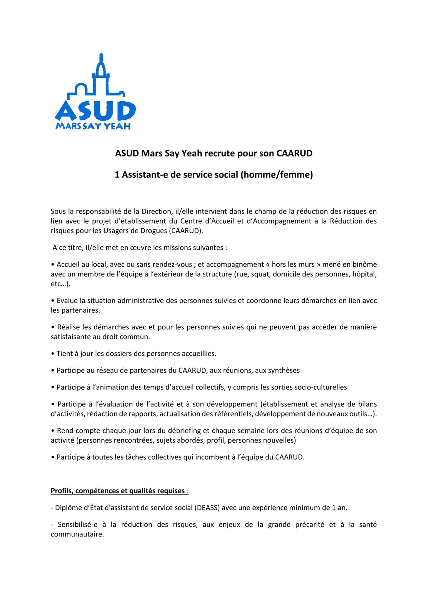 ASUD Mars Say Yeah recrute un.e assistant.e de service social basé.e à Marseille. Sous la responsabilité de la Direction, il.elle intervient dans le champ de la réduction des risques en lien avec le projet d’établissement du Centre d’Accueil et d’Accompagnement à la Réduction des risques pour les Usagers de Drogues (CAARUD).
