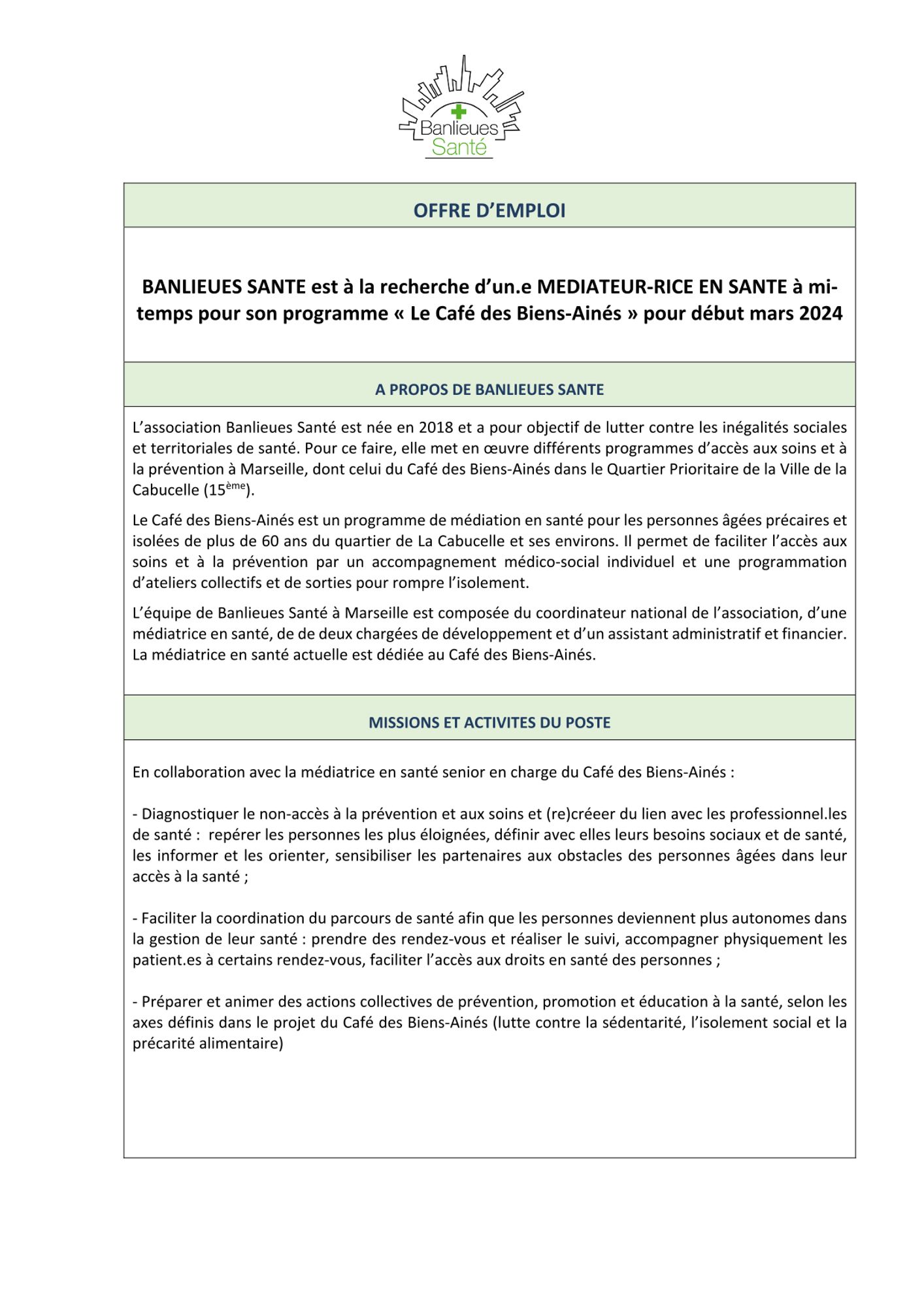 CV et lettre de motivation à envoyer avant le 31/01/2024 à pamela@banlieues-sante.org