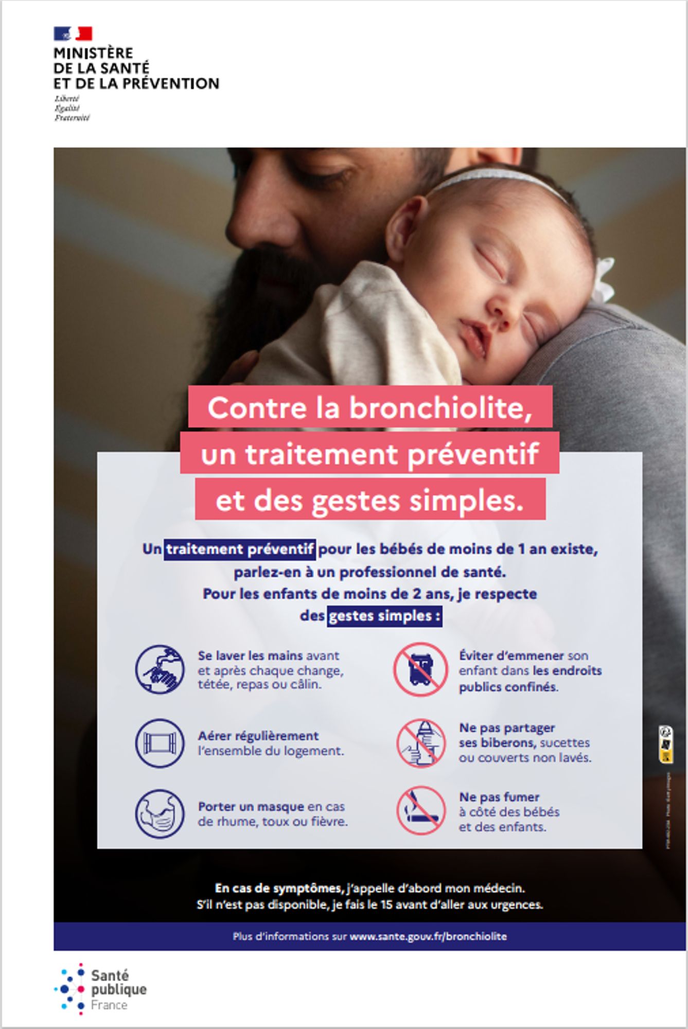 Les parents de nourrissons et jeunes enfants peuvent adopter des gestes barrières et des comportements simples et efficaces pour protéger leurs enfants et limiter la transmission du virus à l’origine de la bronchiolite :