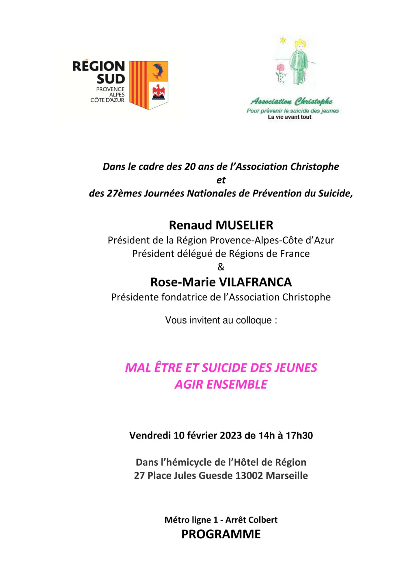 Vous invitent au colloque : MAL ÊTRE ET SUICIDE DES JEUNES : AGIR ENSEMBLE