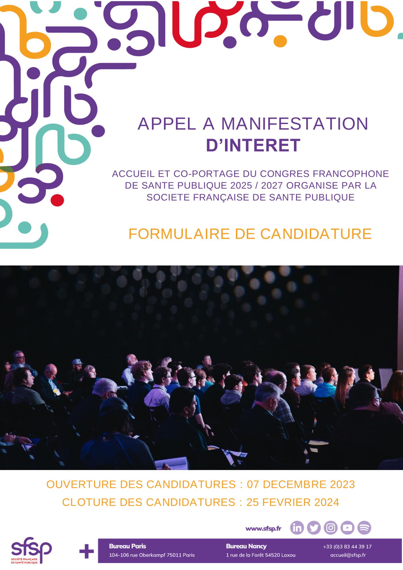 La candidature est à adresser par courriel à : congres@sfsp.fr en indiquant en objet « Candidature – AMI Congrès SFSP 2025-2027 »