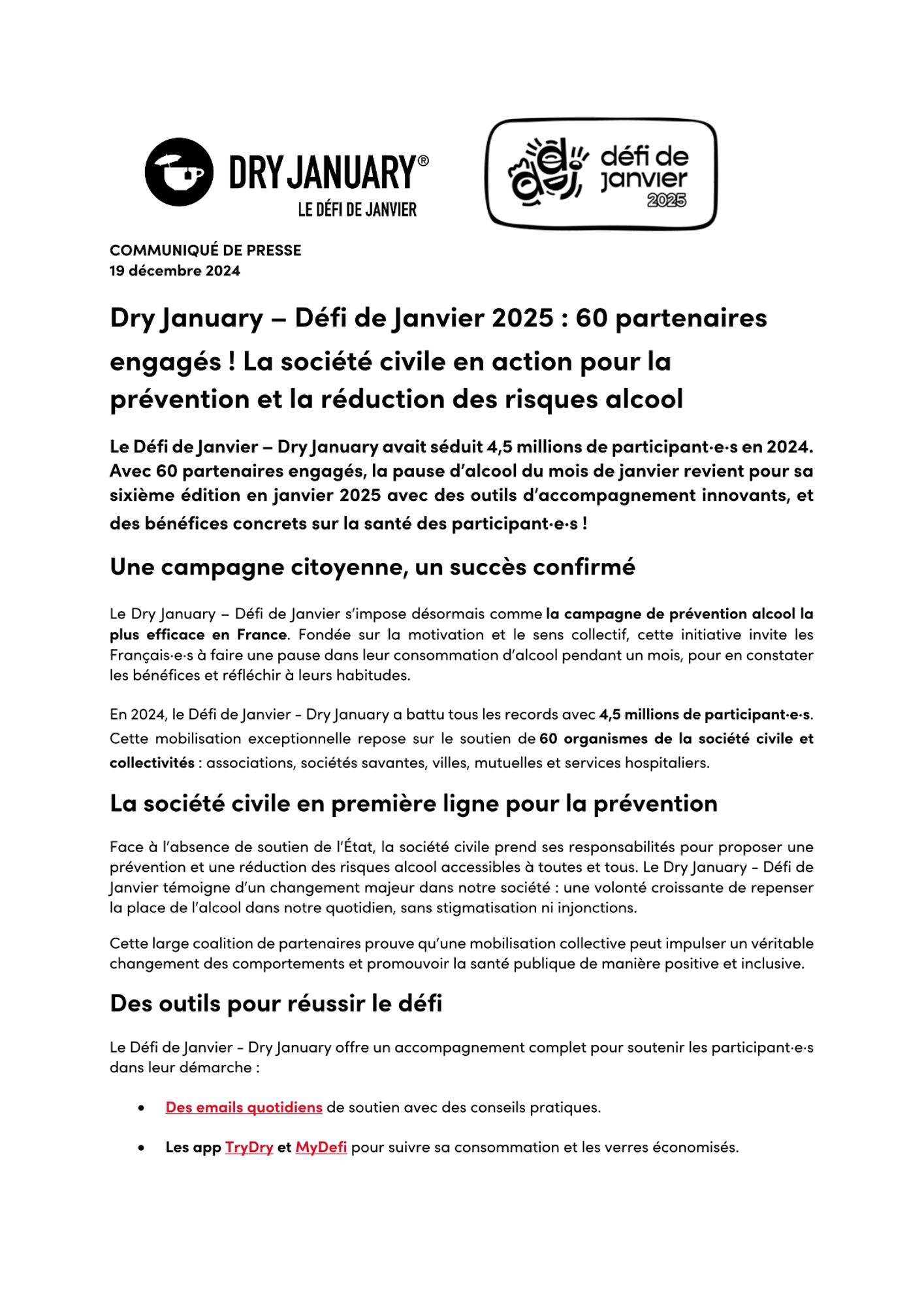 Porté par 63 partenaires engagés, le Dry January est bien plus qu’une pause : c’est une opportunité de réfléchir à sa consommation d’alcool, de partager une expérience positive et de reprendre le contrôle de ses habitudes.