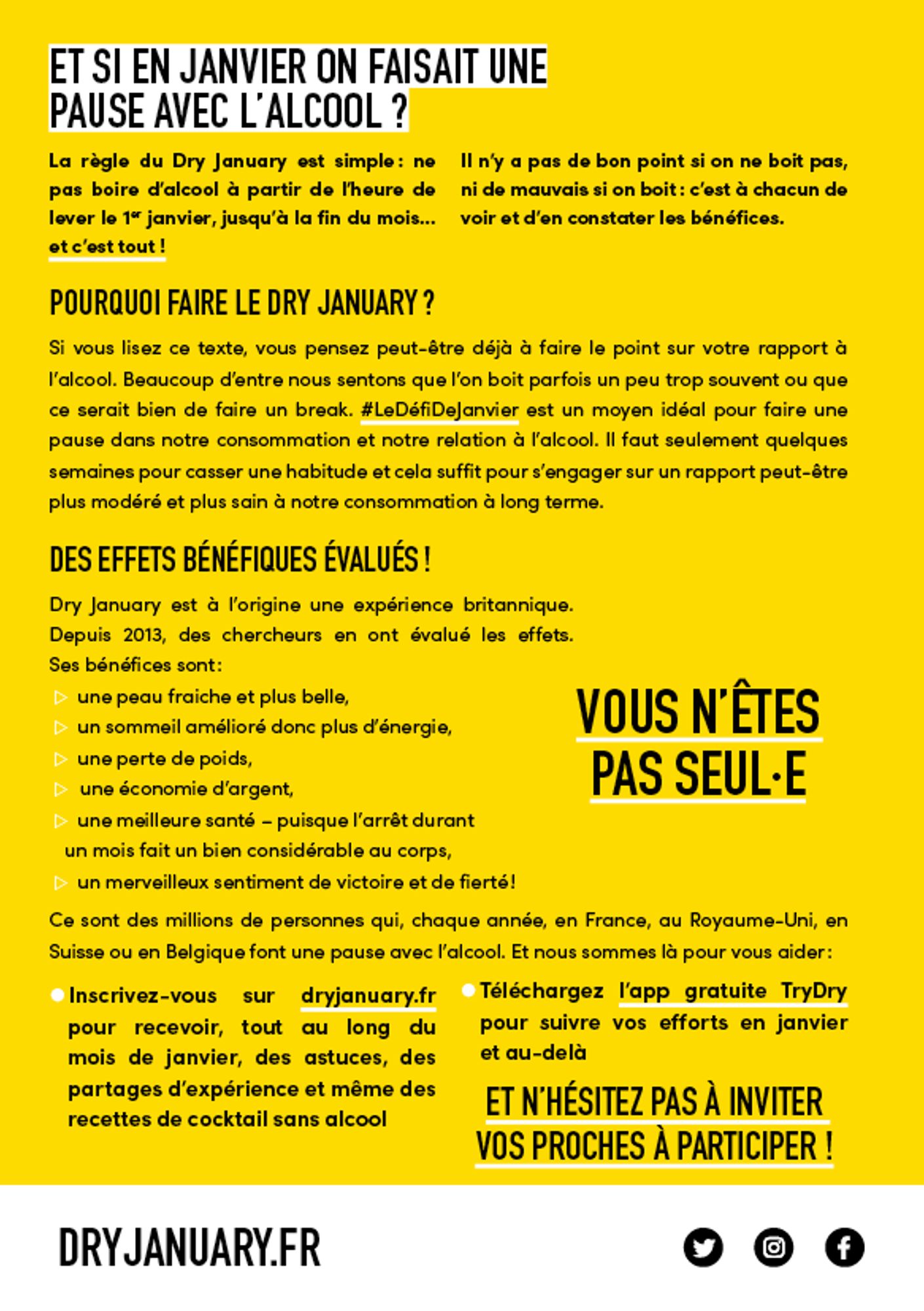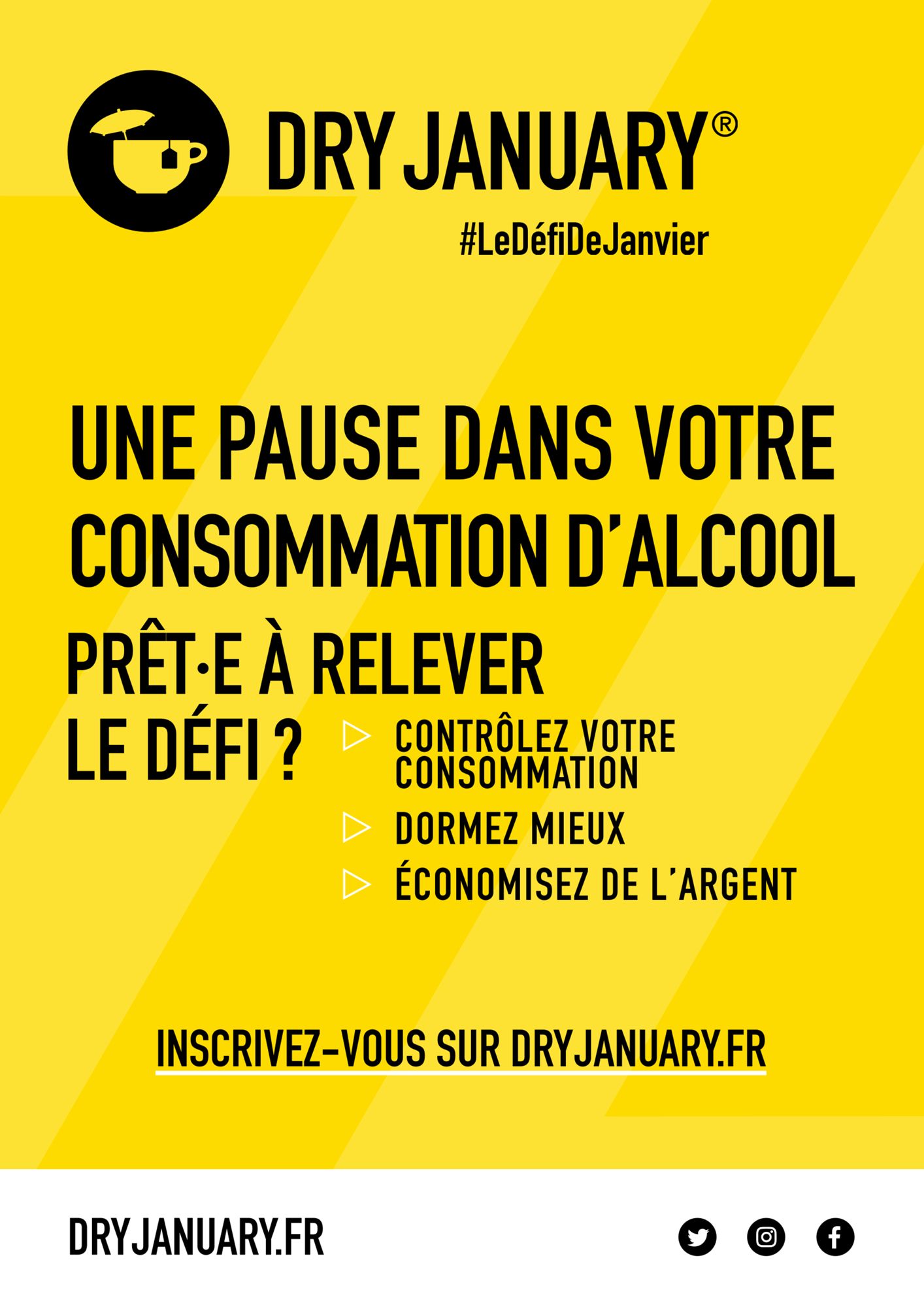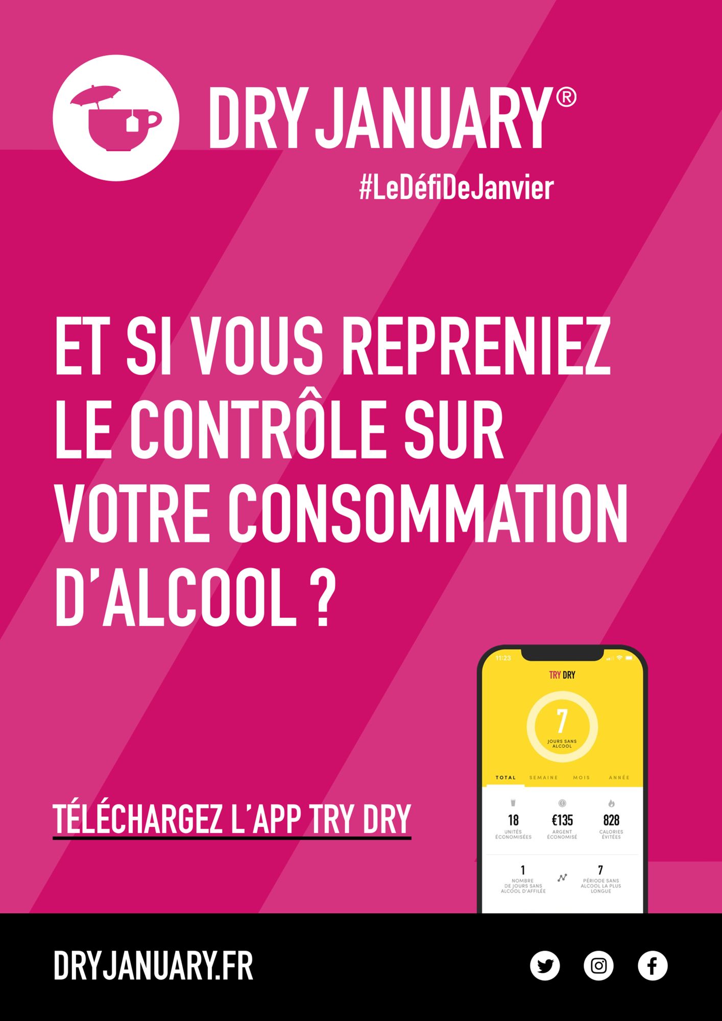 Dry January #LeDéfiDeJanvier Une pause dans votre consommation d'alcool Télécharger les affiches de communication : Rejoignez le mouvement ! (49.9 Ko) Et si vous repreniez le contrôle ? (100.8 Ko) Télécharger l'appli Try Dry #DryJanuary (49.1 Ko) https://dryjanuary.fr/