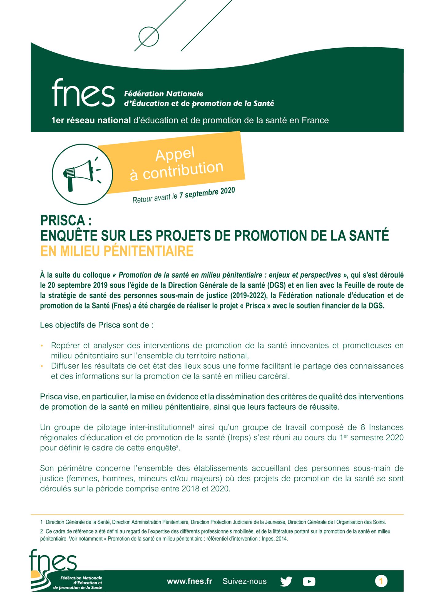 À la suite du colloque « Promotion de la santé en milieu pénitentiaire : enjeux et perspectives », qui s’est déroulé le 20 septembre 2019 sous l’égide de la Direction Générale de la santé (DGS) et en lien avec la Feuille de route de la stratégie de santé des personnes sous-main de justice (2019-2022), la Fédération nationale d’éducation et de promotion de la Santé (Fnes) a été chargée de réaliser le projet « Prisca » avec le soutien financier de la DGS.