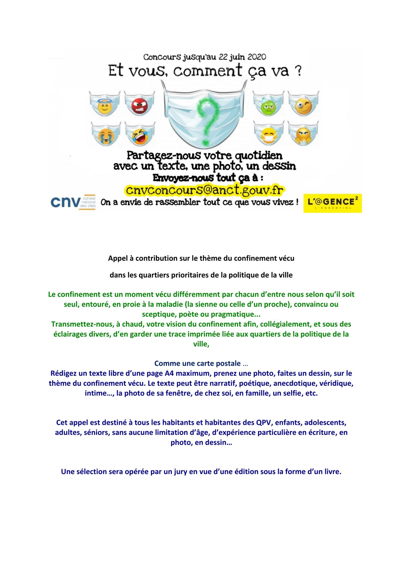 Et vous, comment ça va ? Concours proposé par le Conseil national de villes et l'ANCT Le Conseil national de villes et l'ANCT organise un concours sur le thème du confinement vécu dans les quartiers prioritaires de la politique de la ville (QPV) Télécharger l'appel à contribution (299.4 Ko)