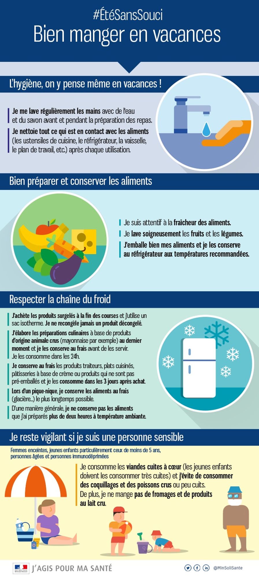 - Bien manger en vacances : observer les règles d’hygiène et de conservation des aliments, respecter la chaîne du froid ;