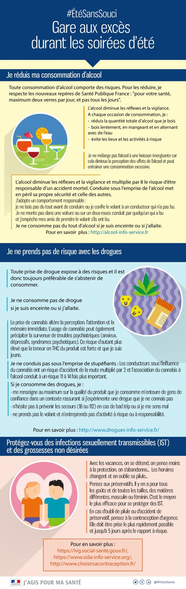 - En soirées : limiter sa consommation d’alcool, ne pas consommer de drogues et se protéger des maladies sexuellement transmissibles ;