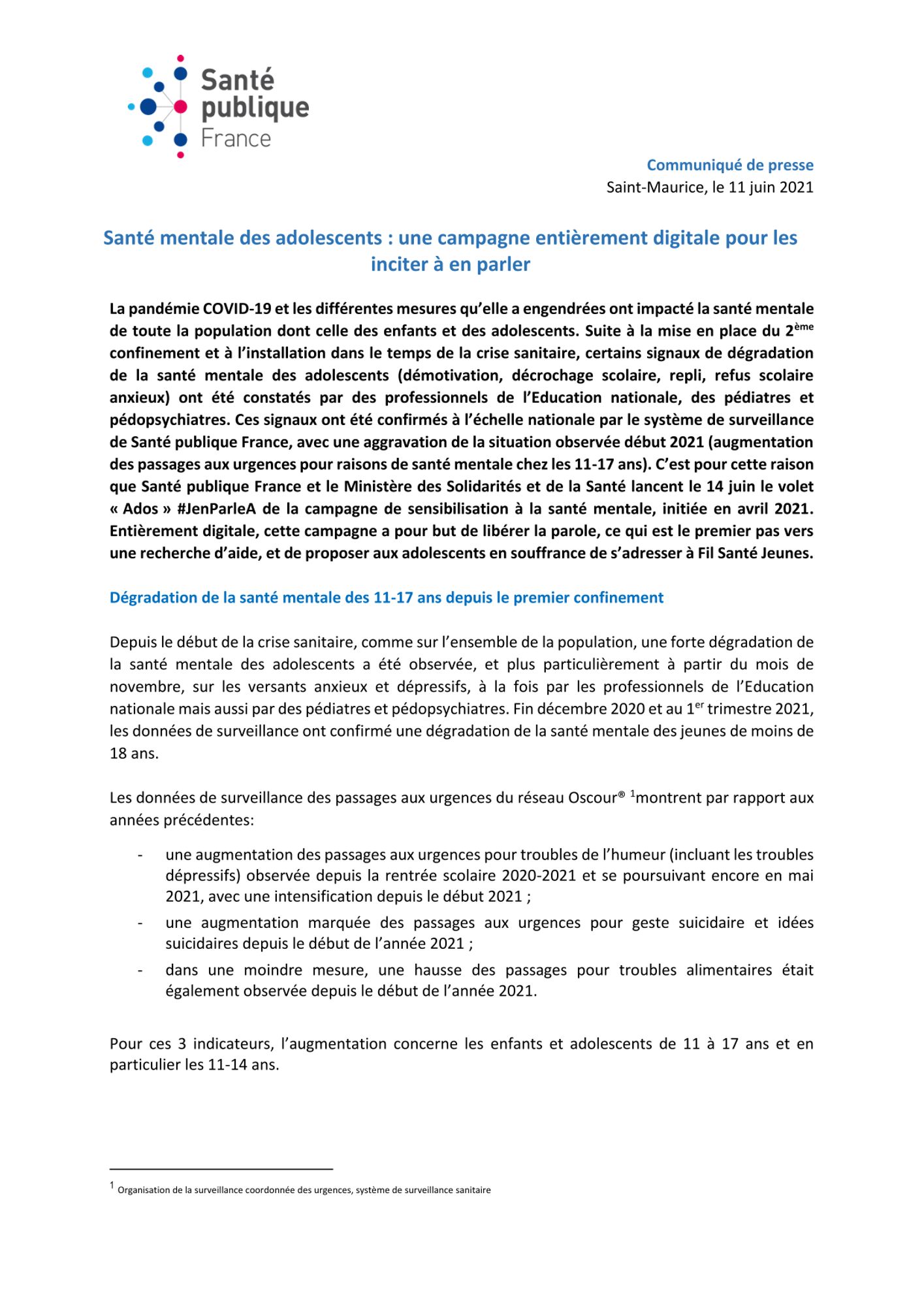 En avril 2021, Santé publique France et le Ministère des Solidarités et de la Santé ont lancé la campagne de sensibilisation à la santé mentale : « En parler, c’est déjà se soigner ».