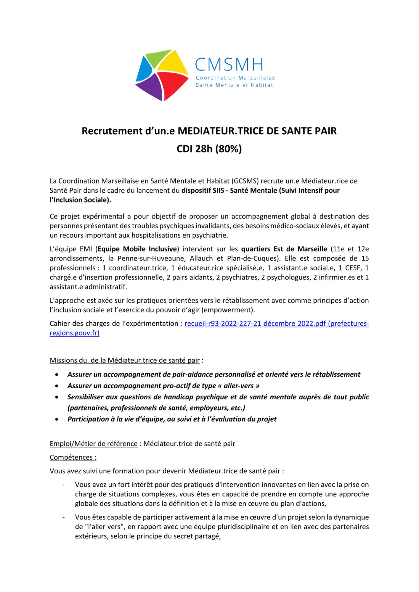 Dans le cadre du lancement du dispositif SIIS - Santé Mentale (Suivi Intensif pour l’Inclusion Sociale), la Coordination Marseillaise en Santé Mentale et Habitat recrute un.e médiateur.trice de santé pair.