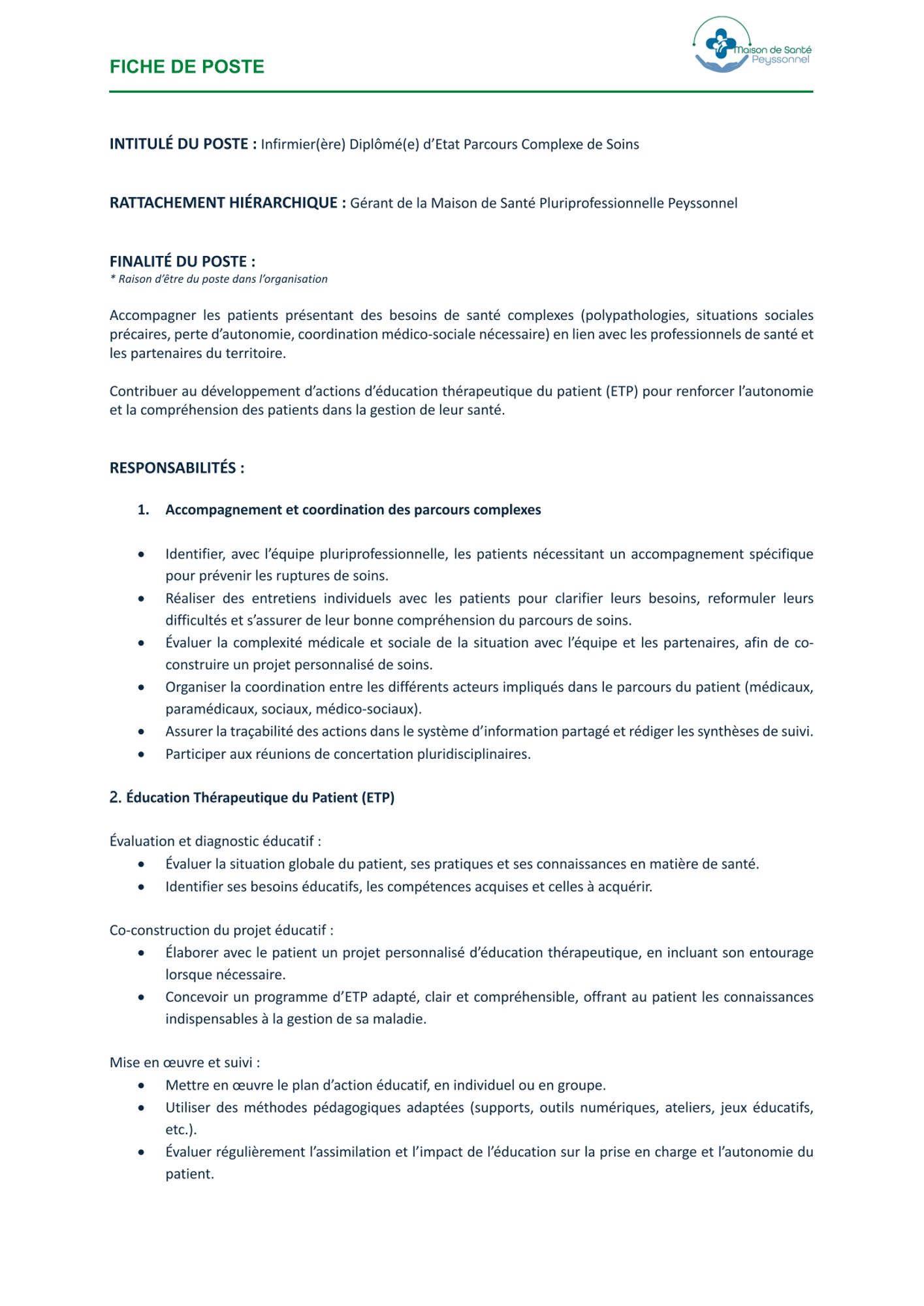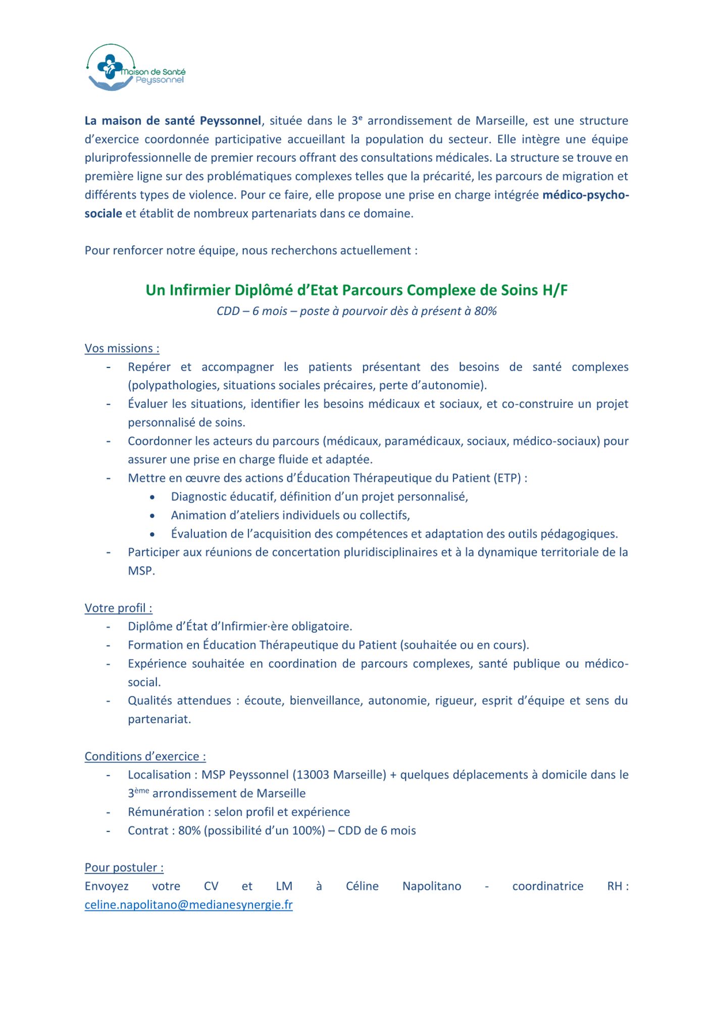 La maison de santé Peyssonnel recrute un.e IDE Parcours Complexe de Soins