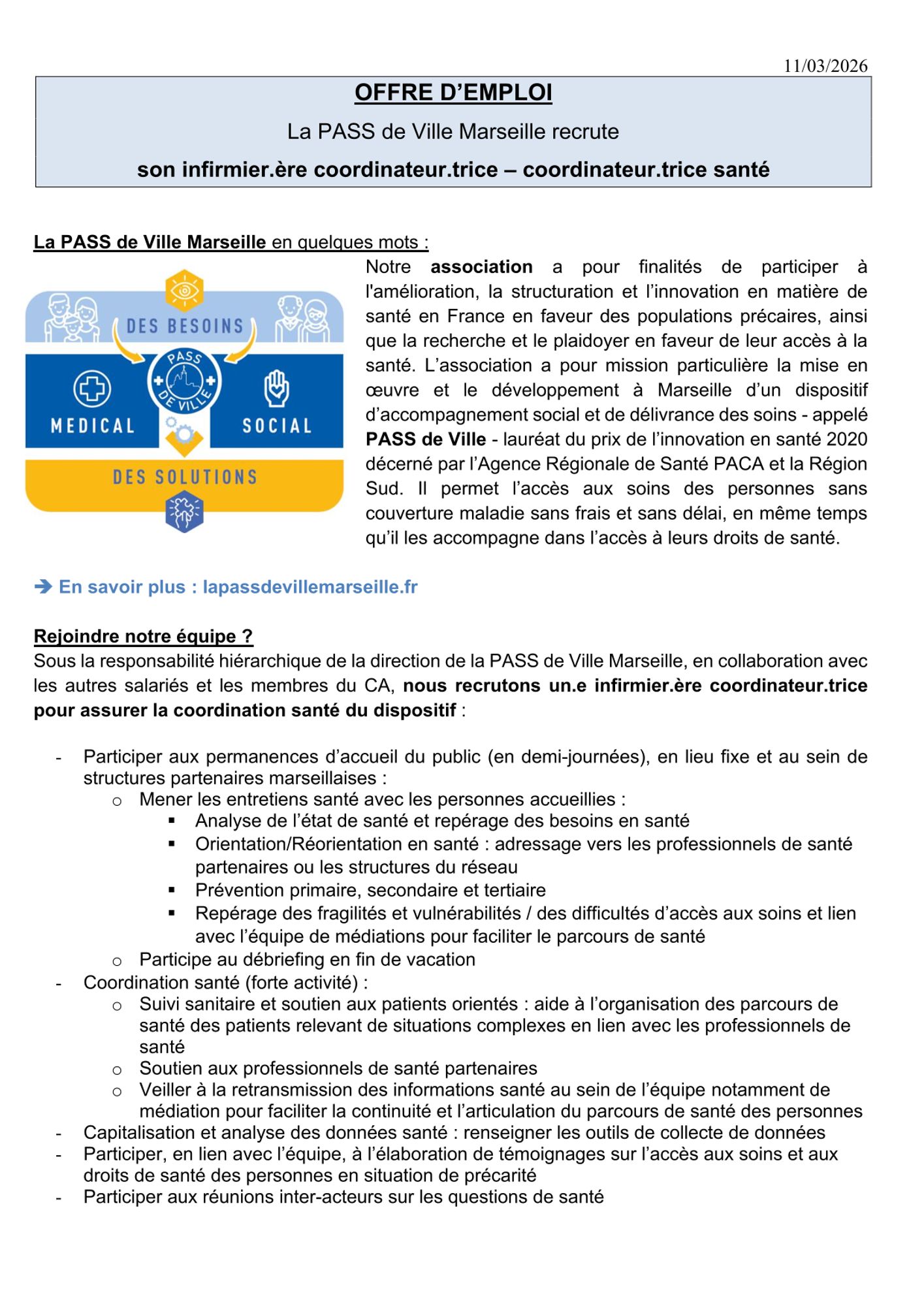 La PASS ville de Marseille recrute un.e infirmier.ère pour assurer la coordination santé du dispositif