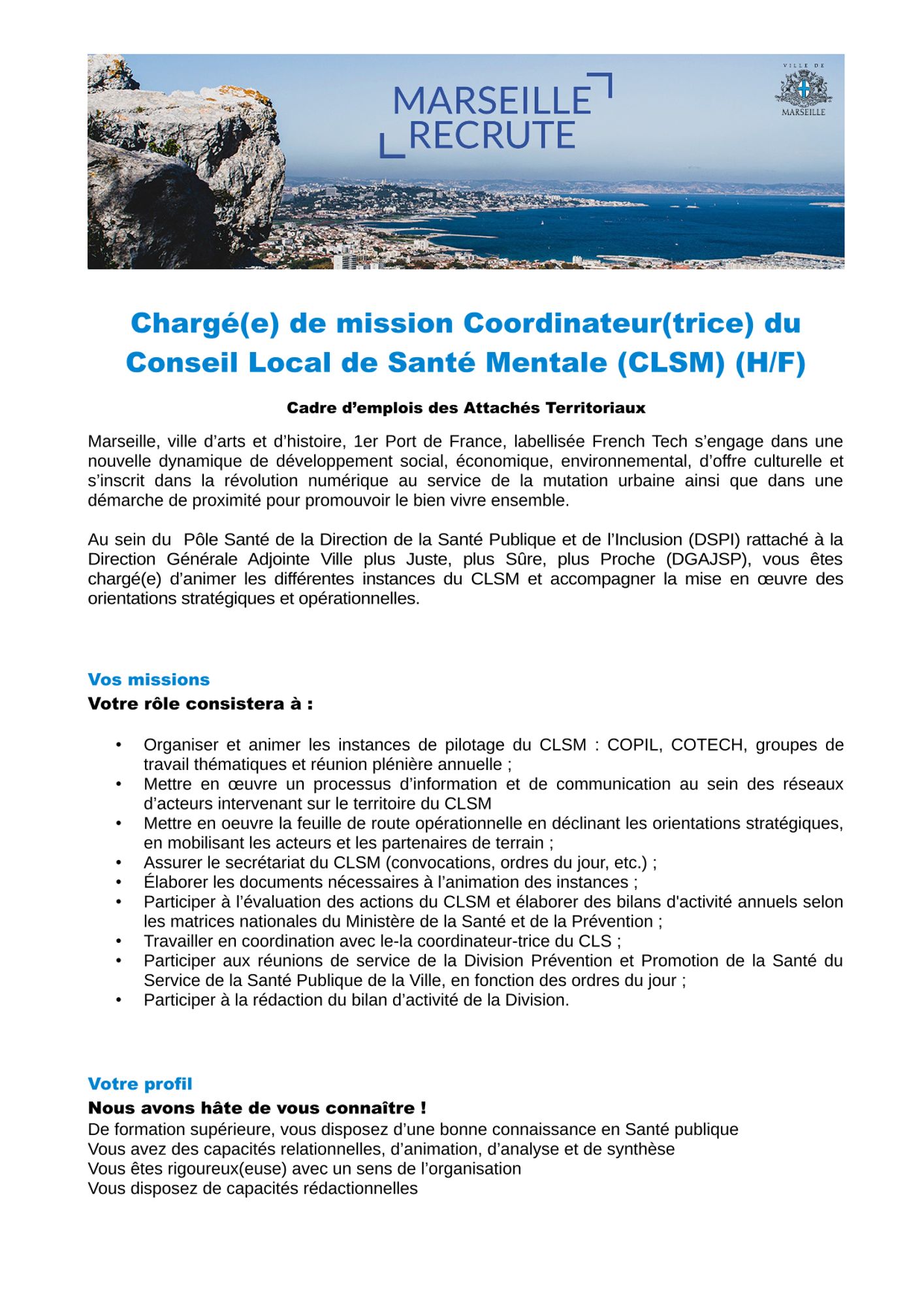 La ville de Marseille recrute un.e chargé.e de mission, coordinateur.trice du Conseil Local de Santé Mentale (CLSM)
