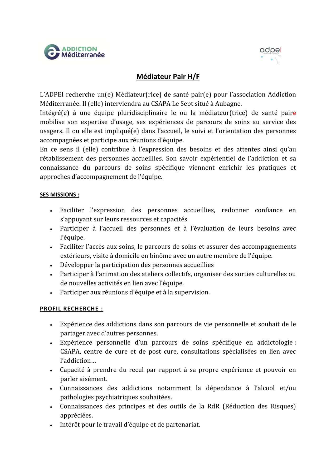 L’ADPEI recherche un.e Médiateur.rice de santé pair.e pour l’association Addiction Méditerranée