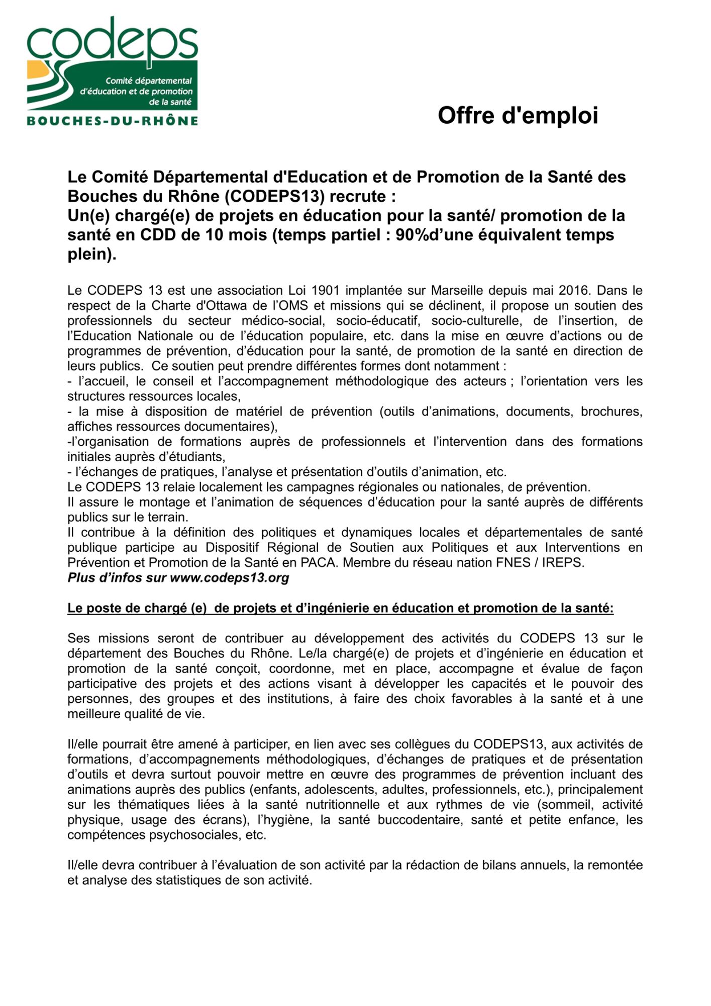 - Il/elle participera, en lien avec ses collègues du CoDEPS13, aux activités de formations, d'accompagnements méthodologiques, d’échanges de pratiques et de présentation d’outils.