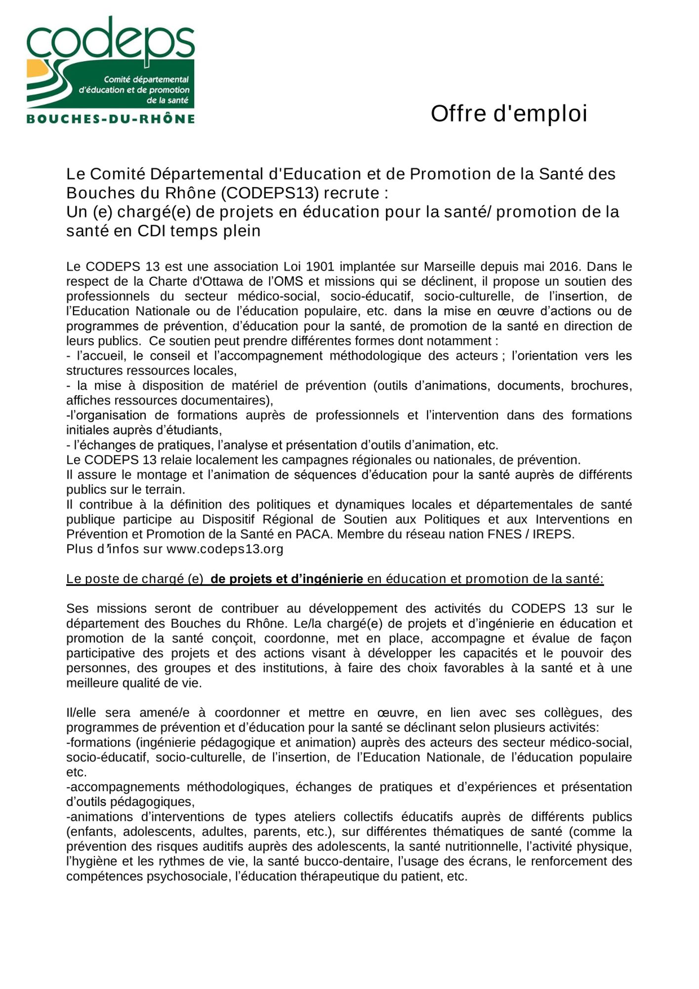 Permis de conduite nécessaire : le/la chargé.e de projets sera amené.e à se déplacer régulièrement dans le département des Bouches-du-Rhône.