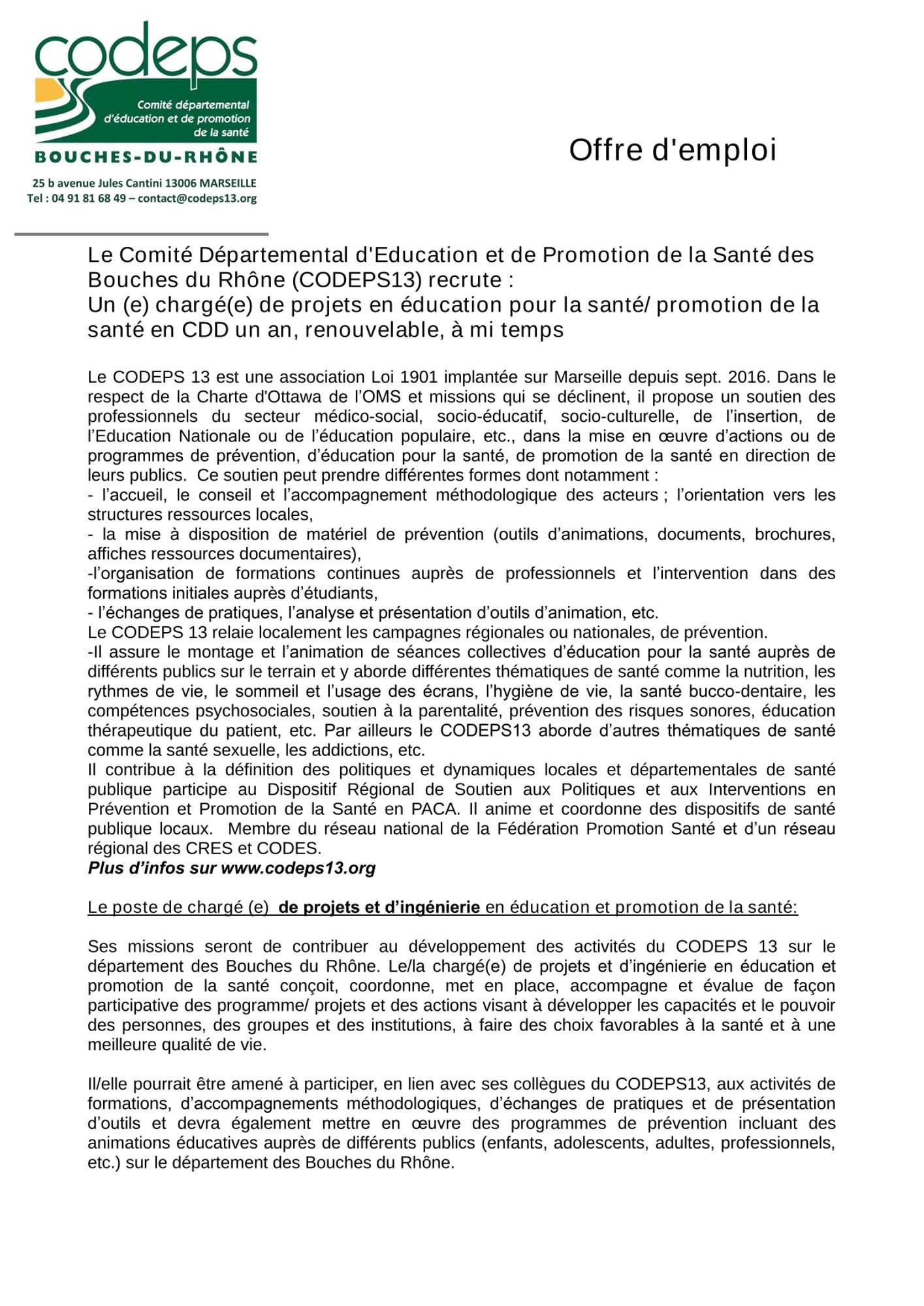 Ses missions seront de contribuer au développement des activités du CODEPS 13 sur le département des Bouches du Rhône. Le/la chargé(e) de projets et d’ingénierie en éducation et promotion de la santé conçoit, coordonne, met en place, accompagne et évalue de façon participative des programme/ projets et des actions visant à développer les capacités et le pouvoir des personnes, des groupes et des institutions, à faire des choix favorables à la santé et à une meilleure qualité de vie.
