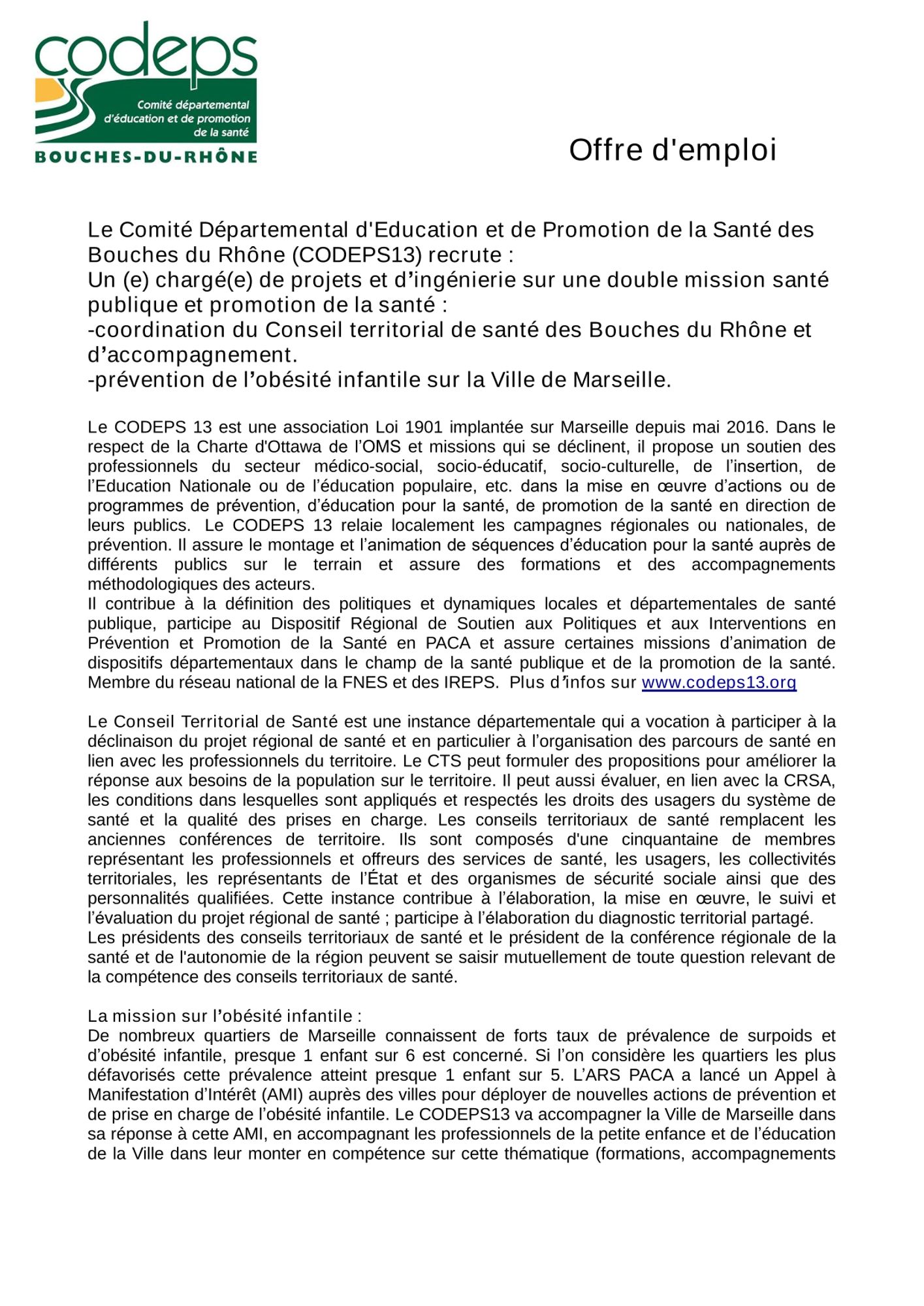 Le CoDEPS13 recrute un.e chargé.e de projets et d'ingénierie sur une double mission santé publique et promotion de la santé