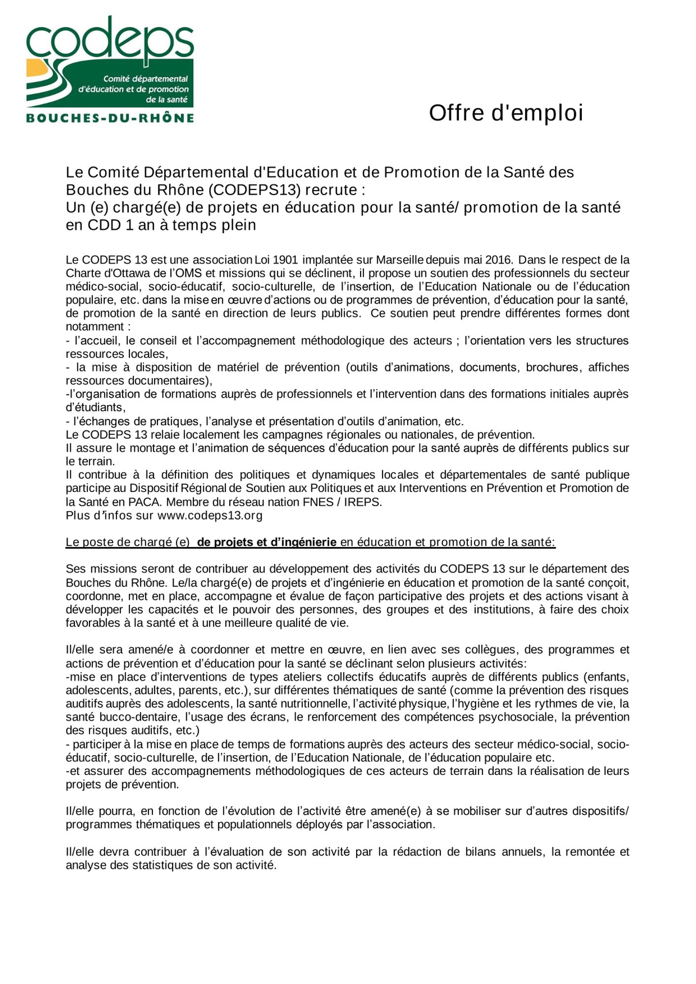 Adresser CV, lettre de motivation à Christophe POROT (directeur) : direction@codeps13.org