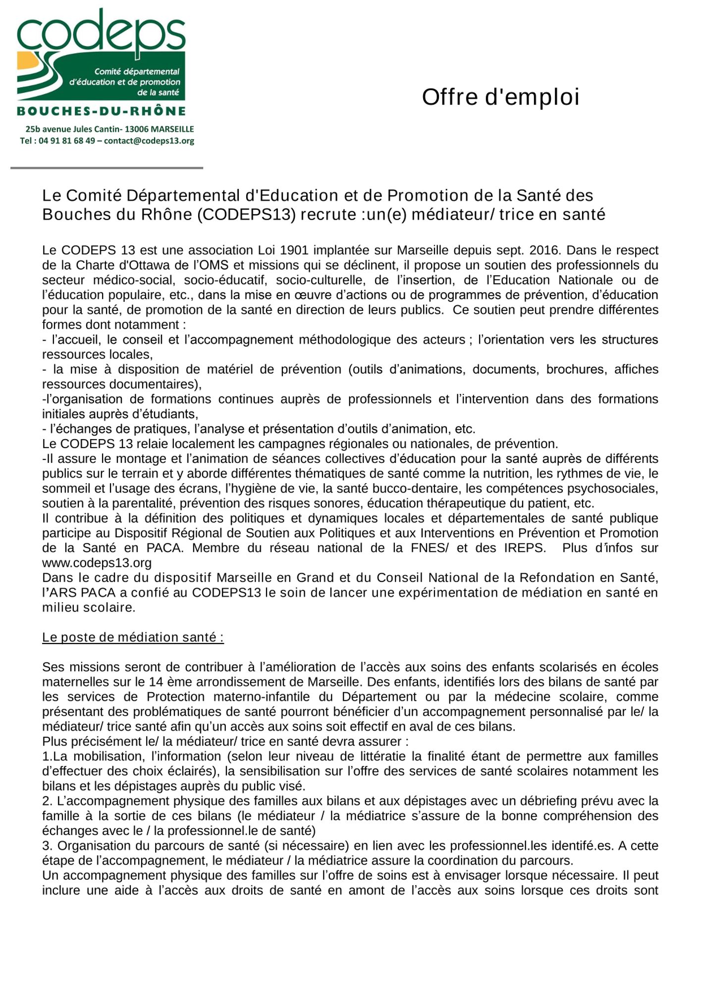 Ses missions seront de contribuer à l’amélioration de l’accès aux soins des enfants scolarisés en écoles maternelles sur le 14 ème arrondissement de Marseille. Des enfants, identifiés lors des bilans de santé par les services de Protection materno-infantile du Département ou par la médecine scolaire, comme présentant des problématiques de santé pourront bénéficier d’un accompagnement personnalisé par le/ la médiateur/ trice santé afin qu’un accès aux soins soit effectif en aval de ces bilans.