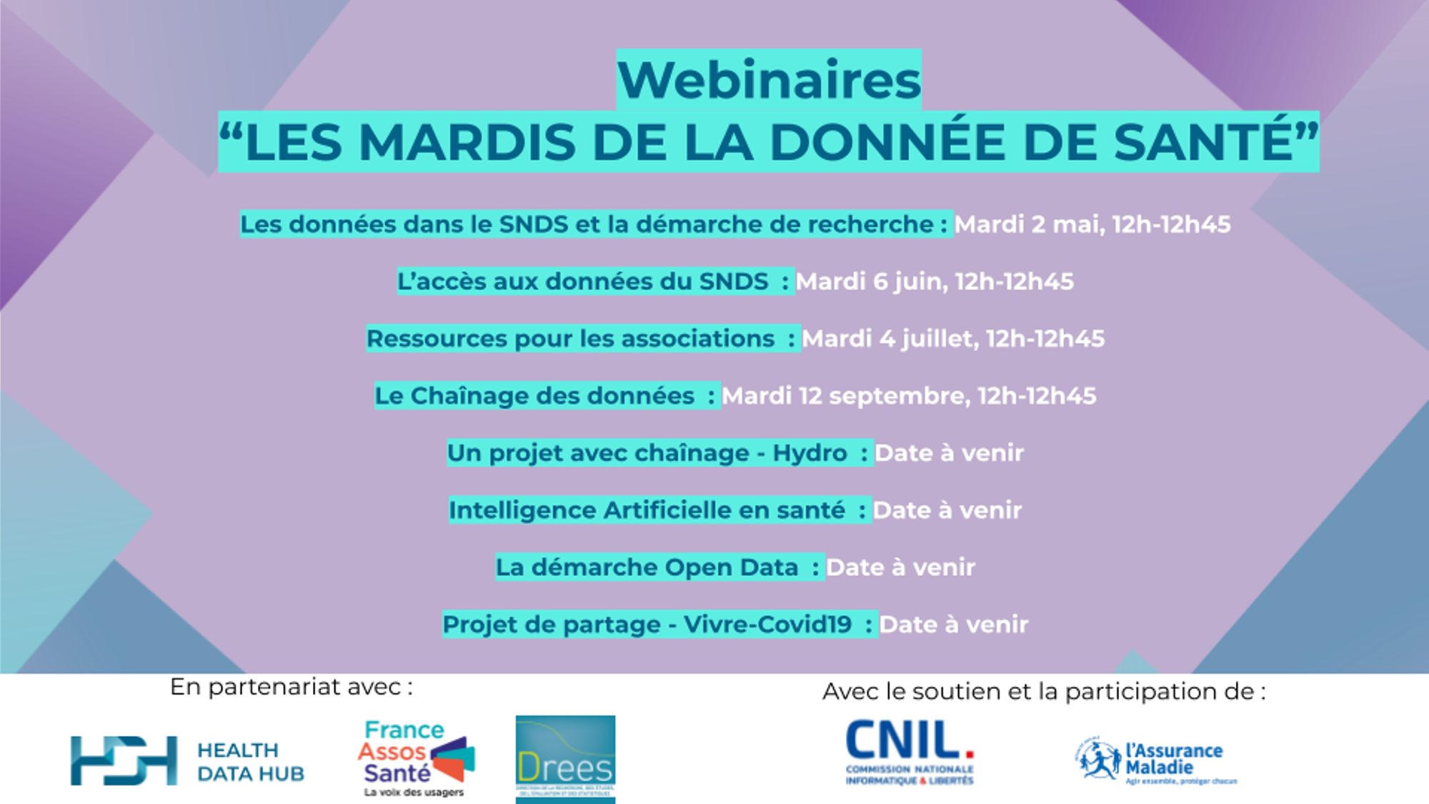 Le Health Data Hub et ses partenaires lancent une série de webinaires "Les Mardis de la donnée de santé" qui vise à diffuser la formation citoyenne au Système national des données de santé (SNDS) co-construite avec la CNAM, la CNIL, la DREES et France Assos Santé.