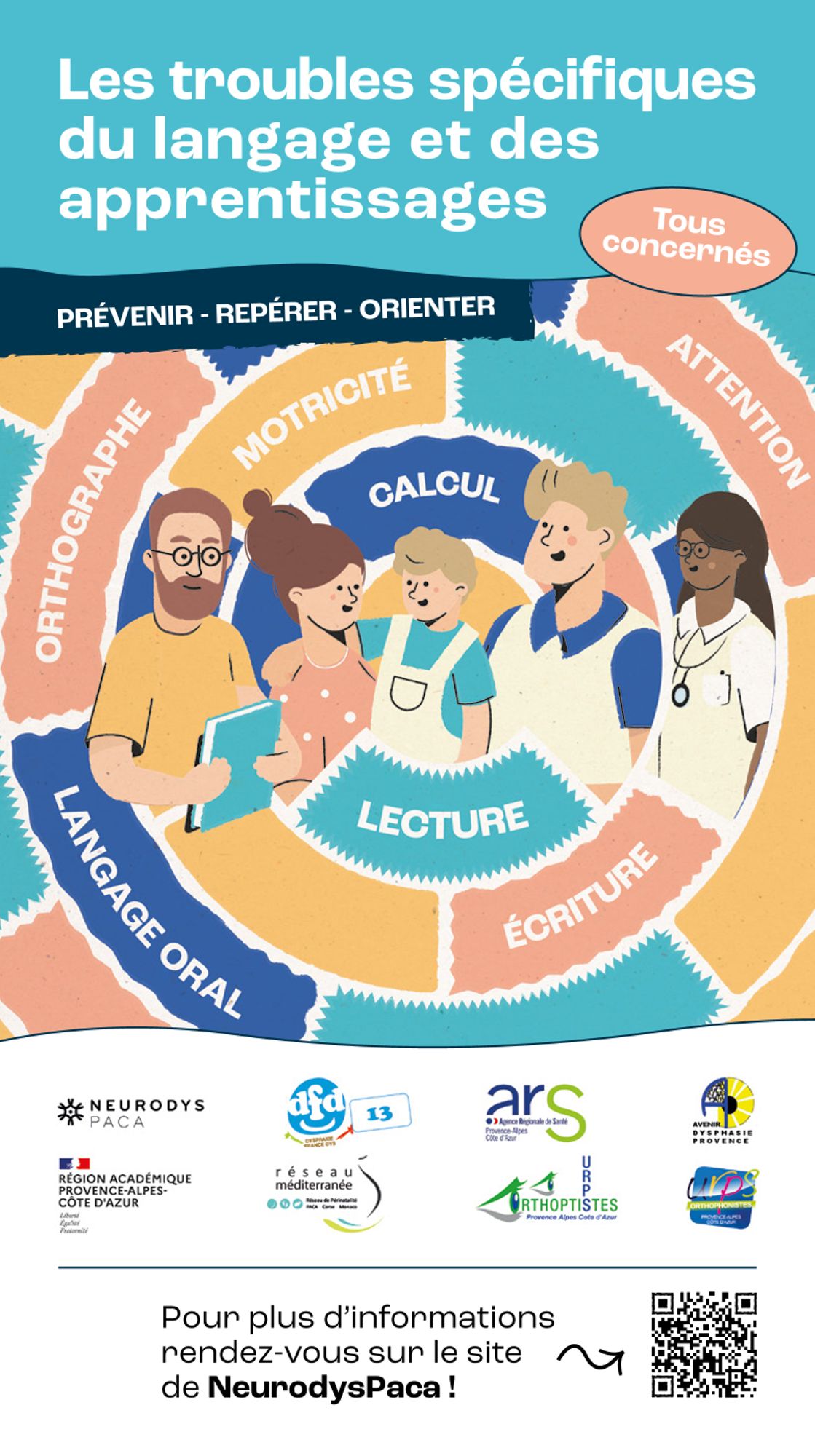 L'Agence régionale de santé Provence-Alpes-Côte d'Azur, en lien avec le dispositif régional Résodys, les Académies d'Aix-Marseille et de Nice, les représentant.es des professionnel.le.s de santé et de l'éducation et les associations de familles, a réalisé un guide d'aide au repérage, à la prévention et à la prise en charge des troubles spécifiques du langage et des apprentissages (TSLA).