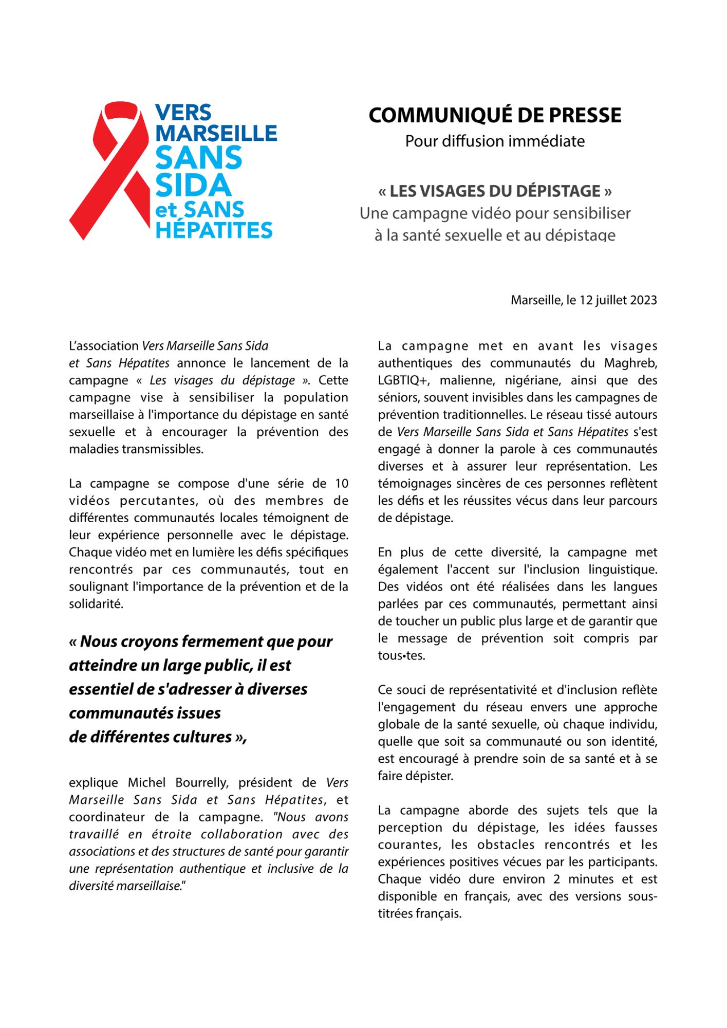 Pour plus d'informations, des interviews ou des demandes de partenariat, contacter Michel Bourrelly, Président de Vers Marseille Sans Sida et Sans Hépatites :
