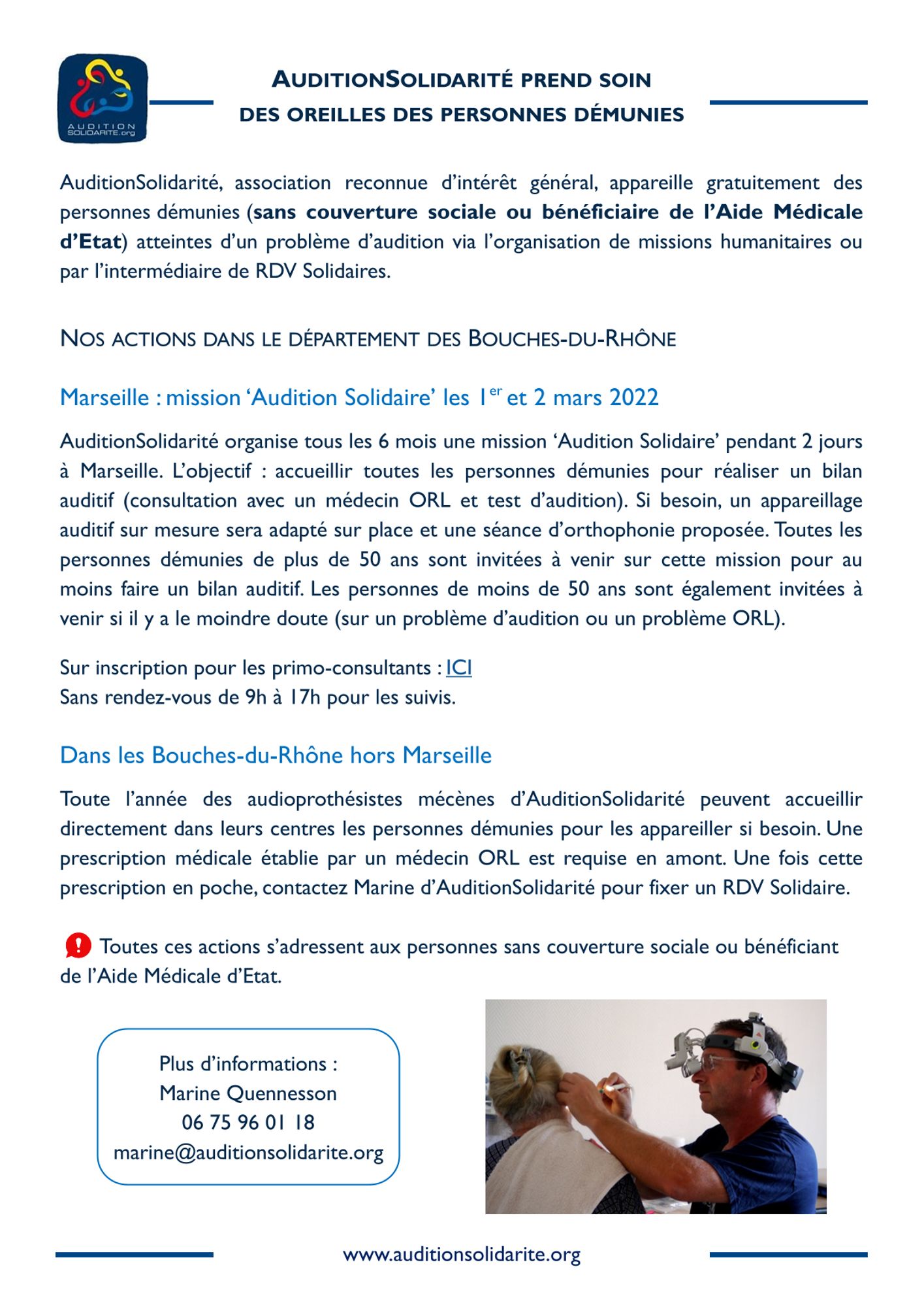 AuditionSolidarité organise tous les 6 mois une mission ‘Audition Solidaire’ pendant 2 jours à Marseille. L’objectif : accueillir toutes les personnes démunies pour réaliser un bilan auditif (consultation avec un médecin ORL et test d’audition). Si besoin, un appareillage auditif sur mesure sera adapté sur place et une séance d’orthophonie proposée. Toutes les personnes démunies de plus de 50 ans sont invitées à venir sur cette mission pour au moins faire un bilan auditif. Les personnes de moins de 50 ans sont également invitées à venir si il y a le moindre doute (sur un problème d’audition ou un problème ORL).