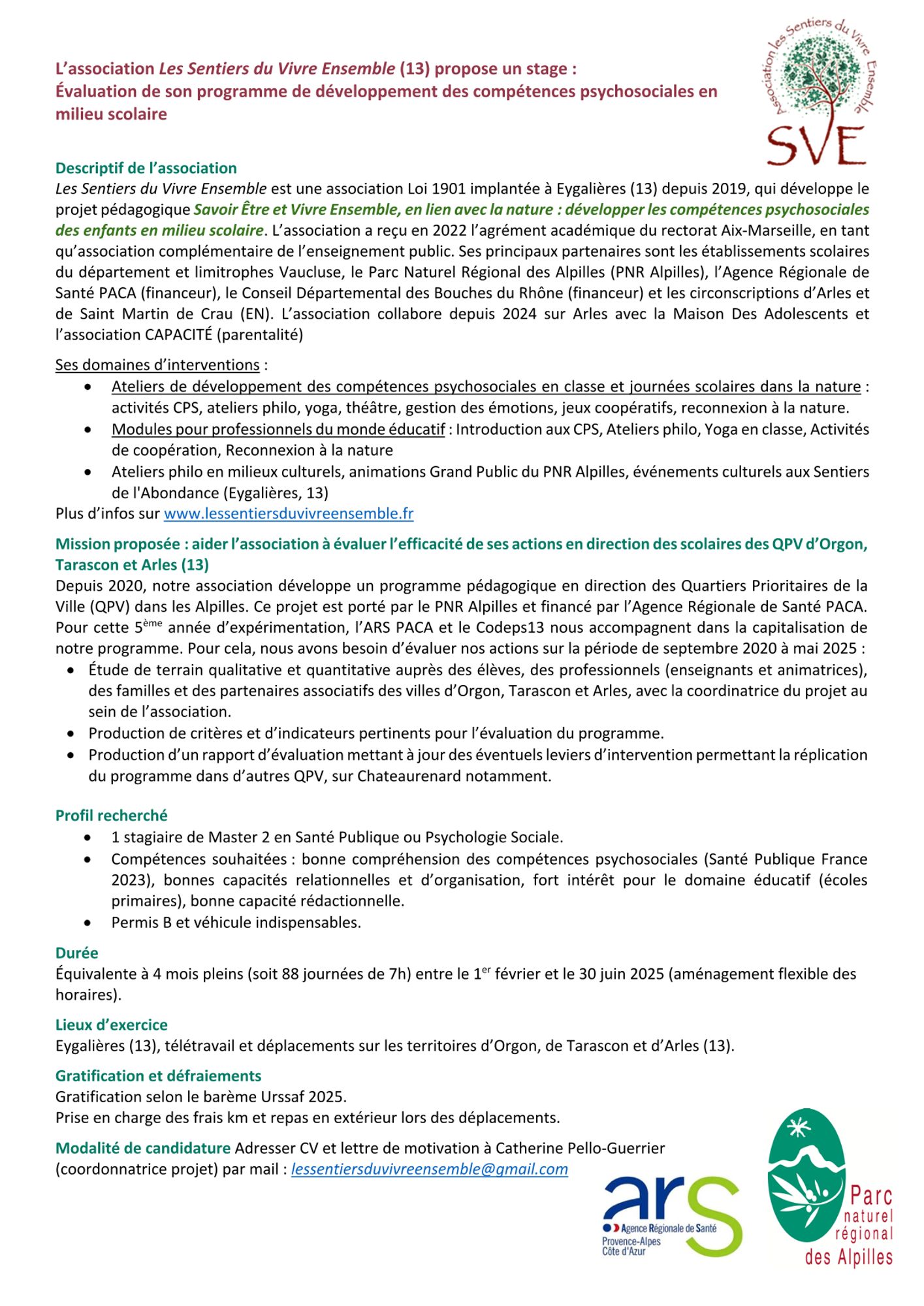 Les Sentiers du Vivre Ensemble, un partenaire du CoDEPS13 depuis plusieurs années, recherche un.e stagiaire de Master 2 en Santé publique ou Psychologie sociale pour évaluer son programme de développement des compétences psychosociales en milieu scolaire : Savoir Être et Vivre Ensemble, en lien avec la nature.