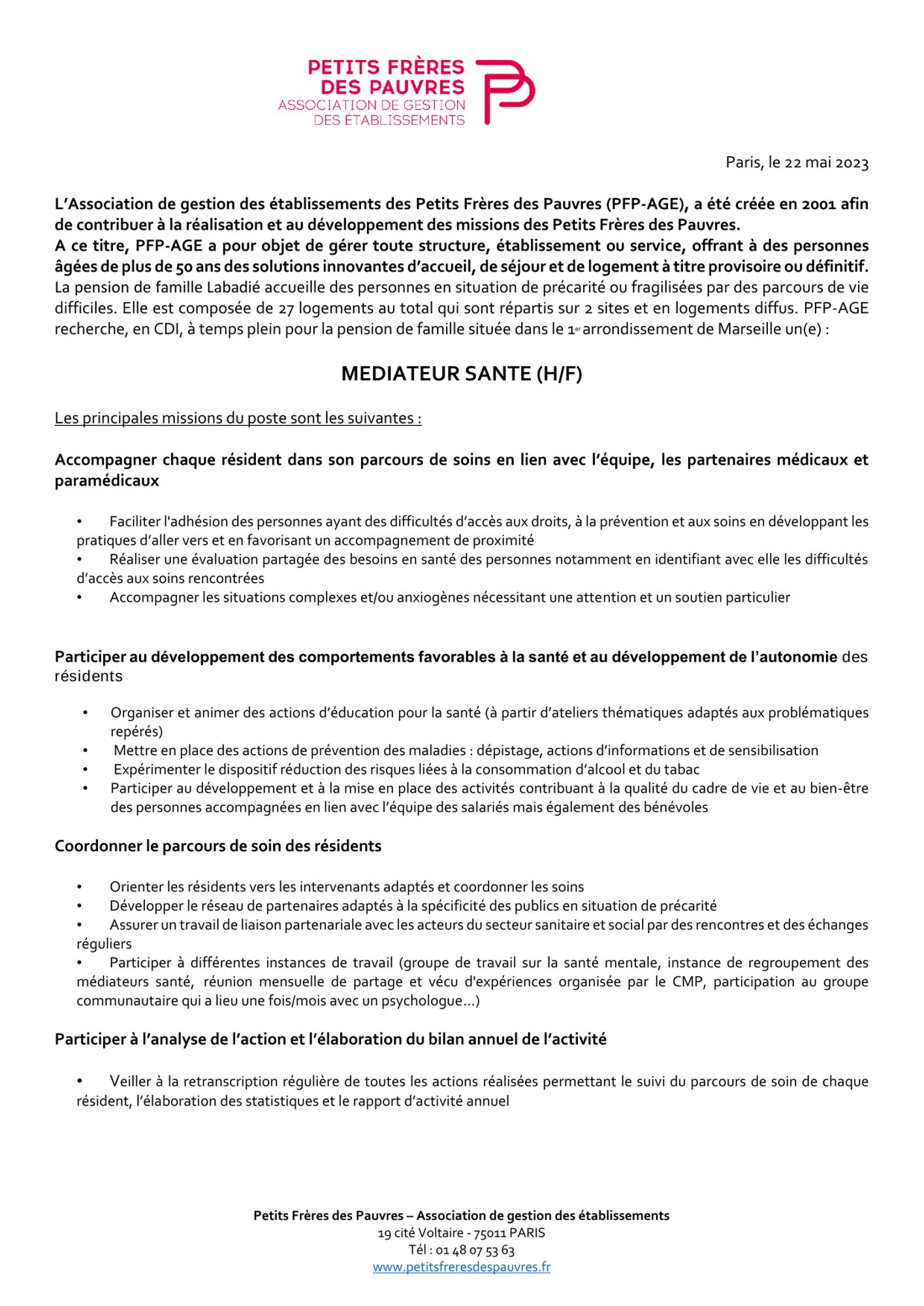 L’association de gestion des établissements des Petits Frères des Pauvres (PFP-AGE) recherche une personne pour assurer la médiation en santé à la pension de famille située dans le 1er arrondissement de Marseille.