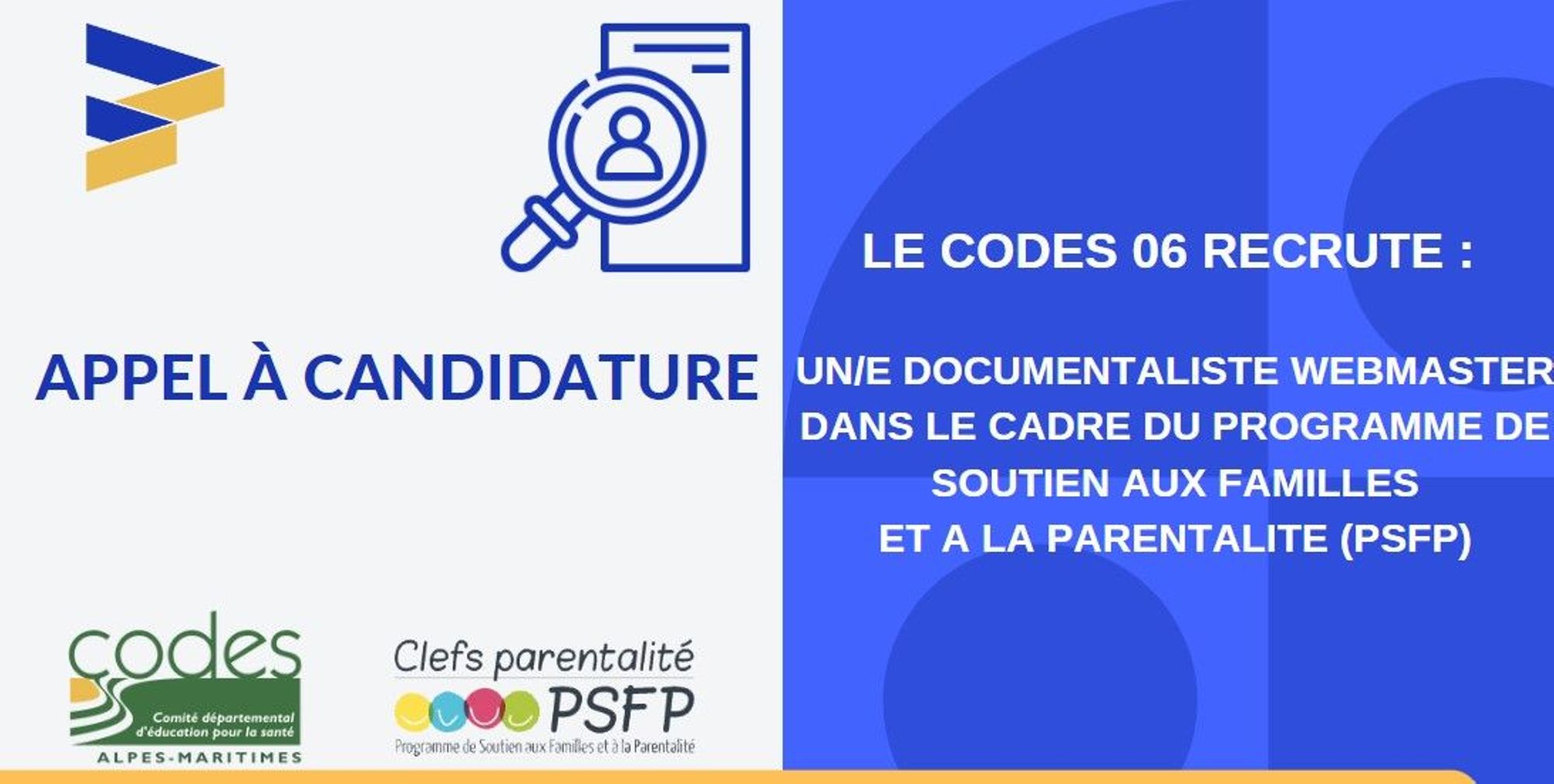 Le CoDES 06 recrute un.e documentaliste webmaster pour assurer la gestion de la Plateforme de ressources numériques du Programme de Soutien aux Familles et à la Parentalité (PSFP) :