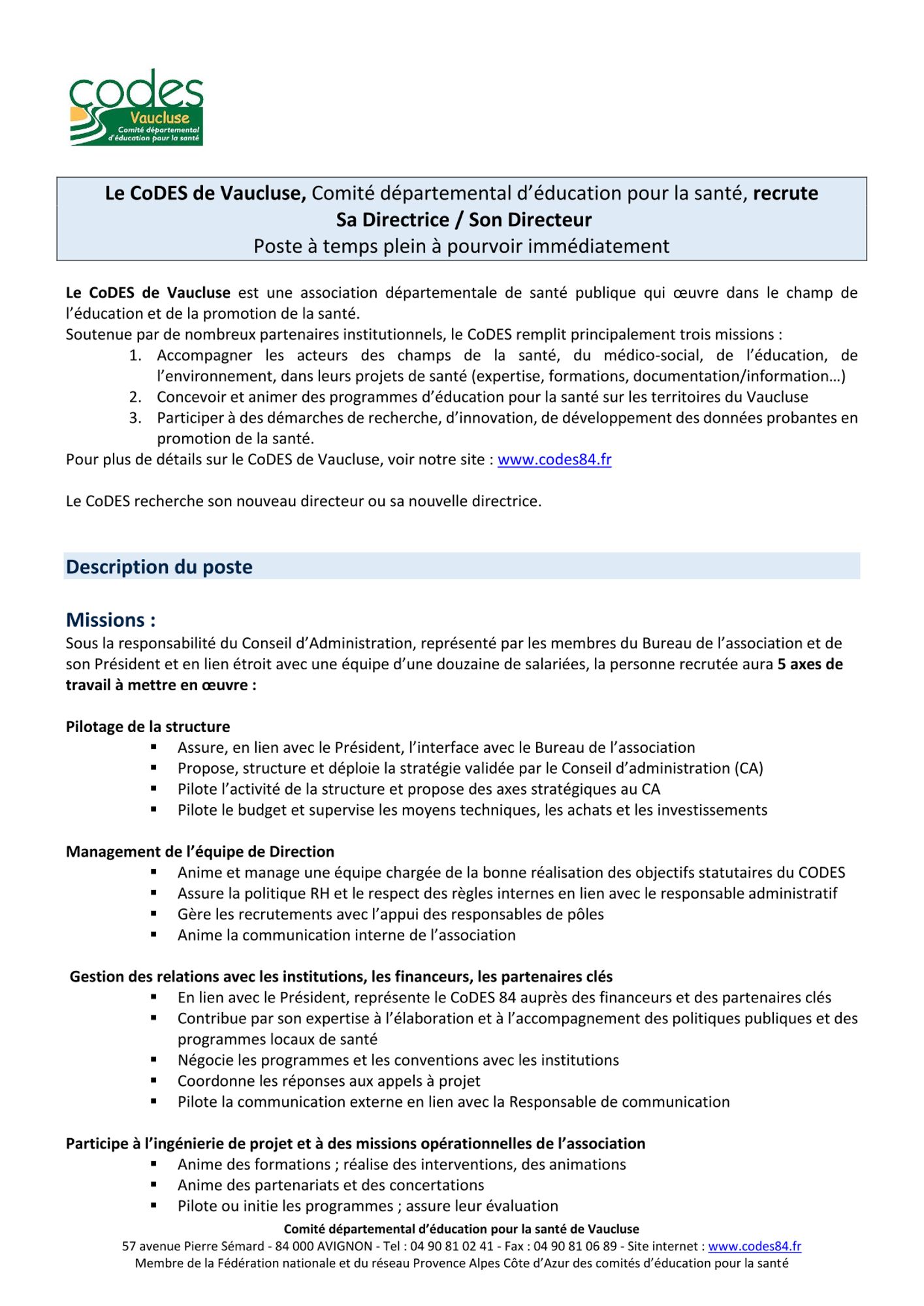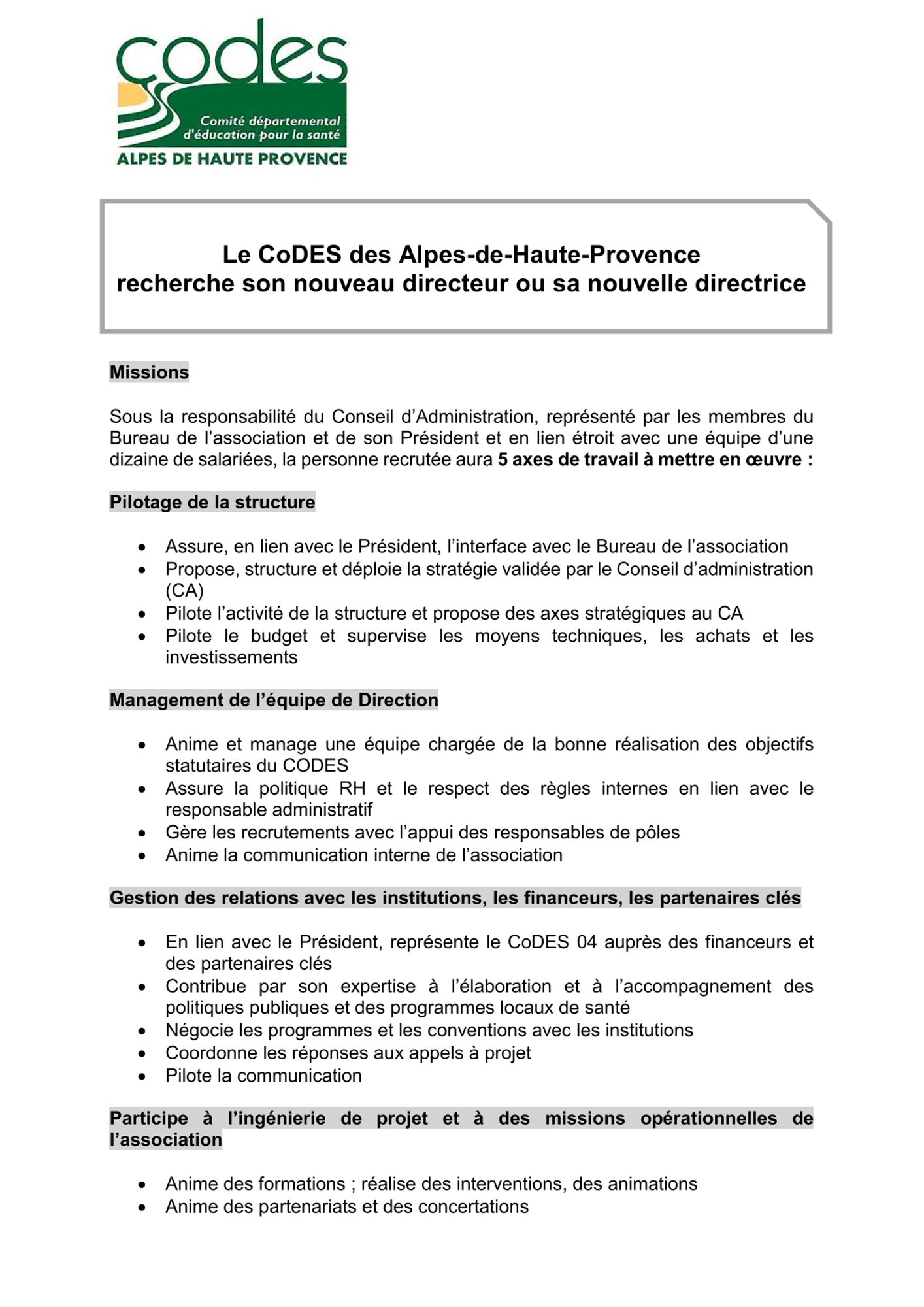 Offres d'emploi dans notre réseau : les Comités de Vaucluse et des Alpes-de-Haute-Provence recherchent leur directrice/directeur Contrats à durée indéterminée à temps plein Recrutement en Avignon au CoDES 84 (536.8 Ko) Recrutement à Digne-les-Bains au CoDES 04 (446.8 Ko)