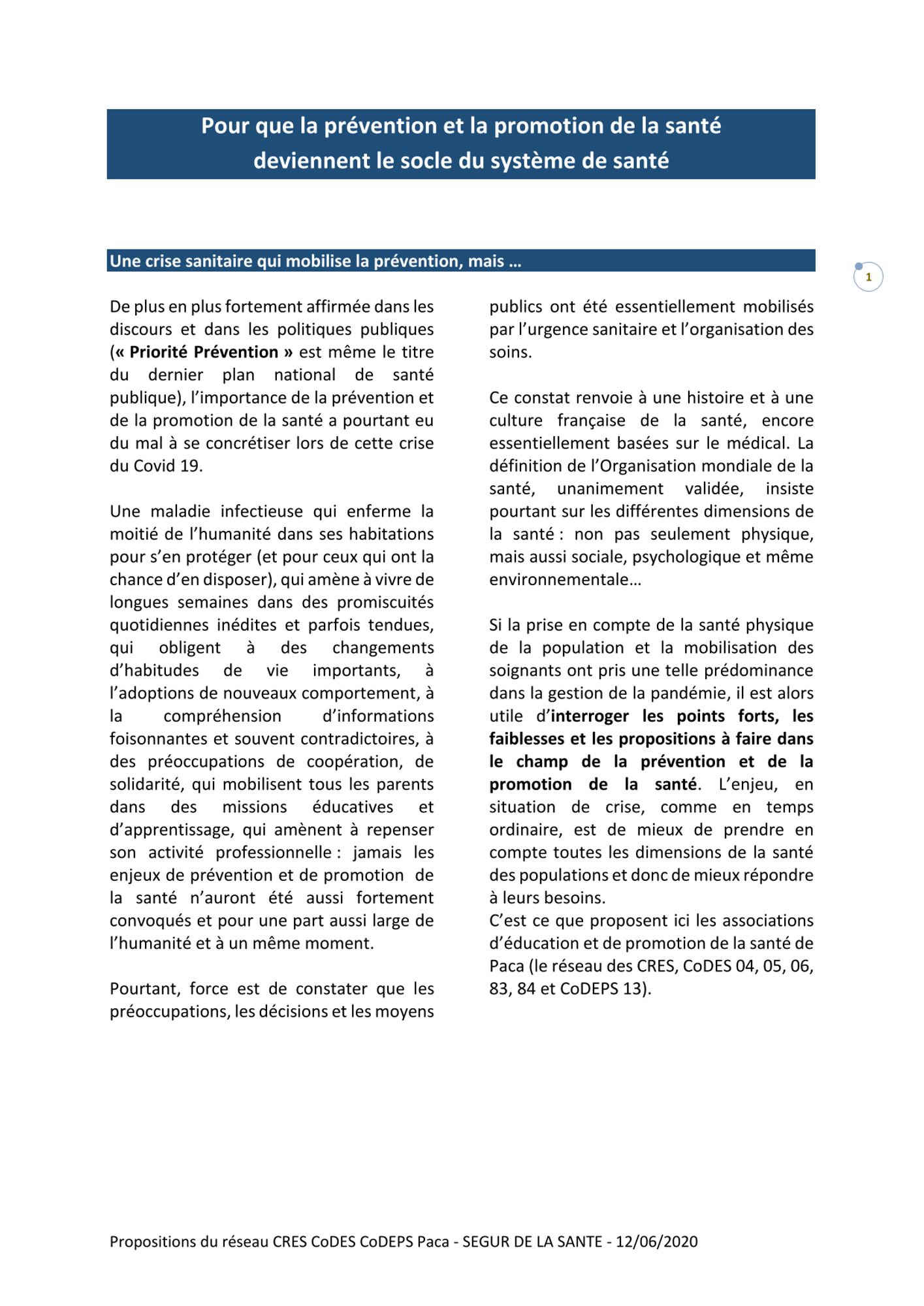 Ségur de la santé : Propositions du réseau CRES CoDES Paca