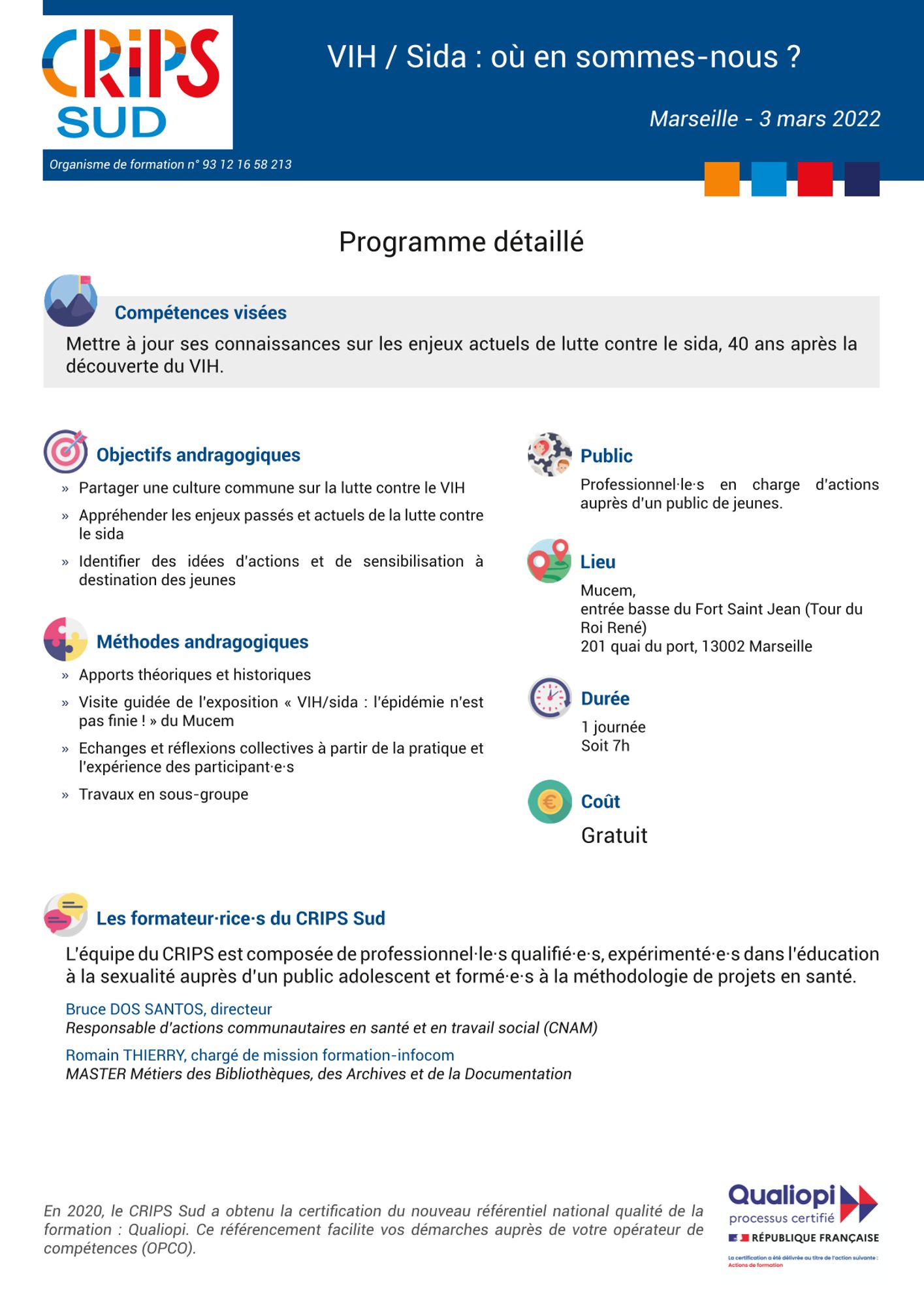 Le CRIPS Sud propose à tou·te·s les professionnel·le·s en charge de jeunes, une journée thématique "VIH/sida, où en sommes-nous" qui inclut la visite guidée de l'exposition du Mucem "VIH/sida : l'épidémie n'est pas finie !". Cette journée, au-delà de la découverte de l'exposition, vise à mettre à jour ses connaissances sur les enjeux actuels de la lutte contre le sida notamment en ce qui concerne le public jeune.