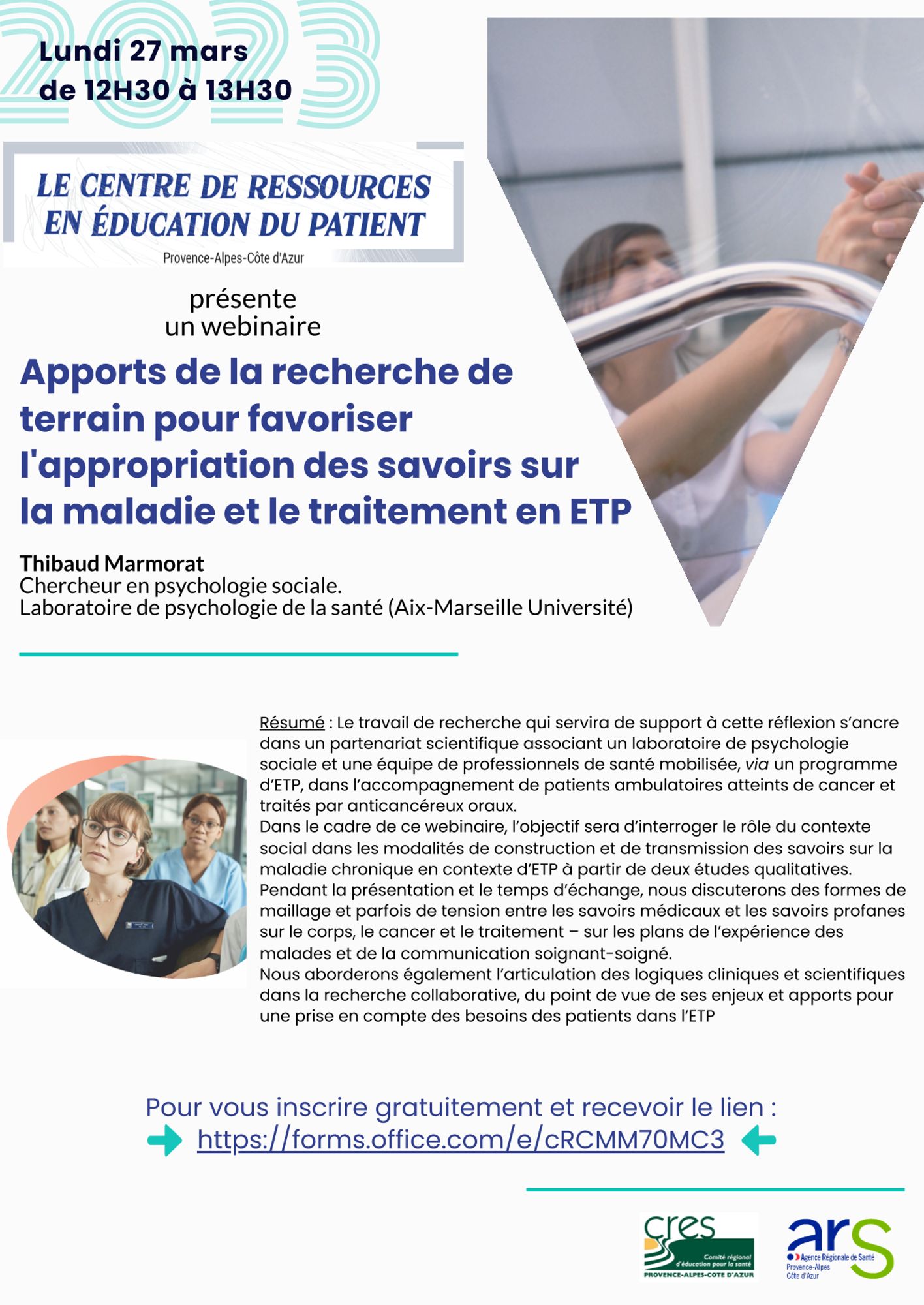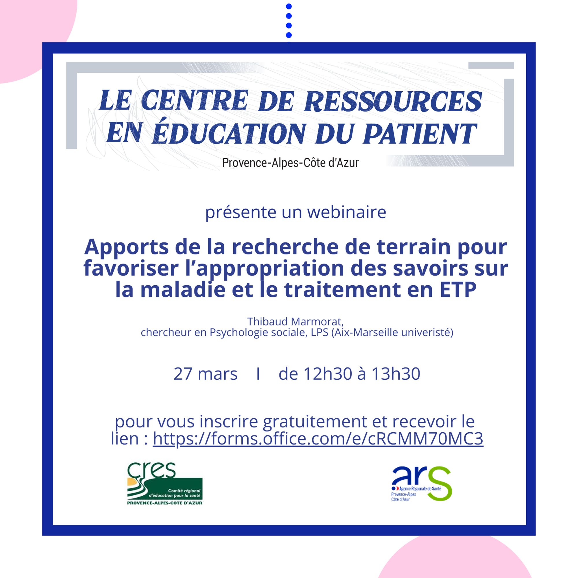 Le Centre de ressources en éducation du patient PACA propose un webinaire lundi 27 mars de 12h30 à 13h30 sur les apports de la recherche de terrain pour favoriser l'appropriation des savoirs sur la maladie et le traitement en ETP.