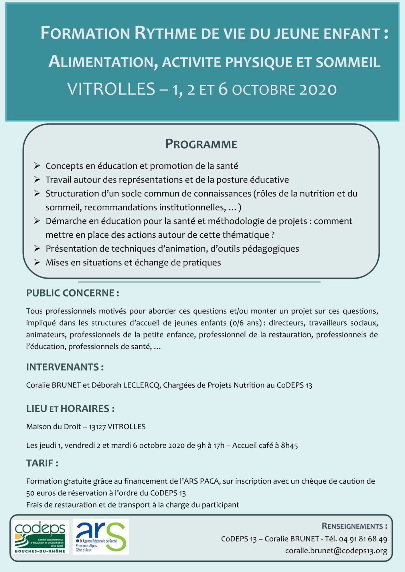Formation gratuite grâce au financement de l’ARS PACA (demande d'un chèque de réservation de 50€ à l'ordre du CoDEPS 13 qui sera rendu à l'issue de la formation).