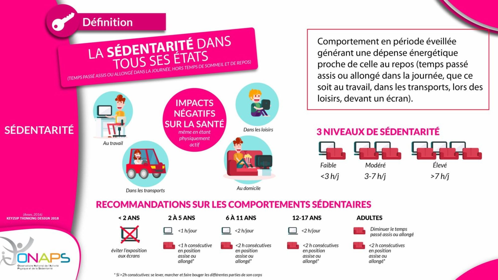 Source : Agence nationale de sécurité sanitaire, alimentation, environnement, travail. Actualisation des repères du PNNS – Révisions des repères relatifs à l'activité physique et à la sédentarité. Anses, 2016, p. 584