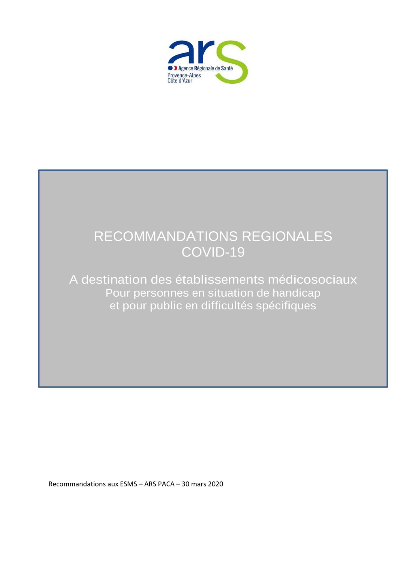 L'ARS PACA diffuse des recommandations à destination des établissements médicosociaux pour personnes en situation de handicap et pour public en difficultés spécifiques. Elles comprennent une synthèse des mesures générales et des fiches pratiques thématiques.