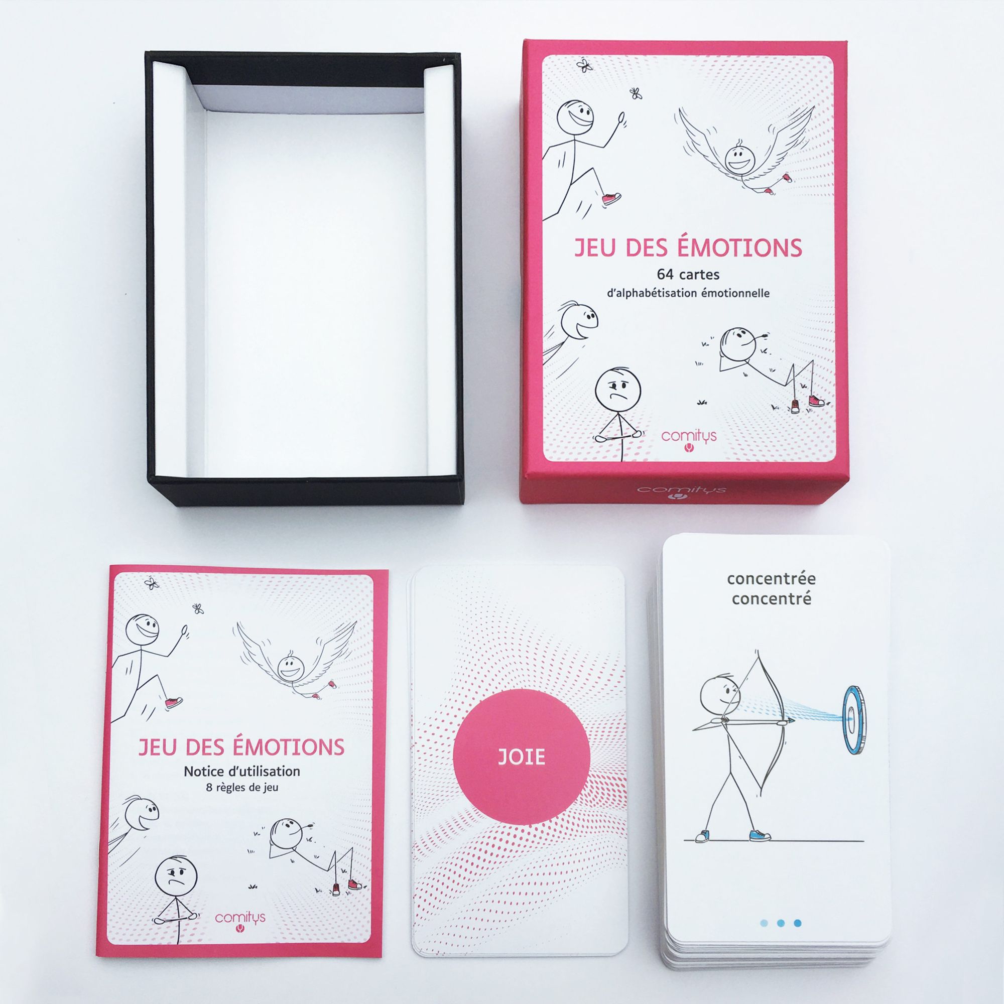 Ce jeu est constitué de 60 cartes qui représentent 60 émotions. Il permet de mettre en scène ou bien simplement de mettre des mots sur les émotions. Il peut servir de support pour un atelier sur la gestion des émotions mais aussi comme outil pour identifier nos différentes émotions, et les mettre en image.